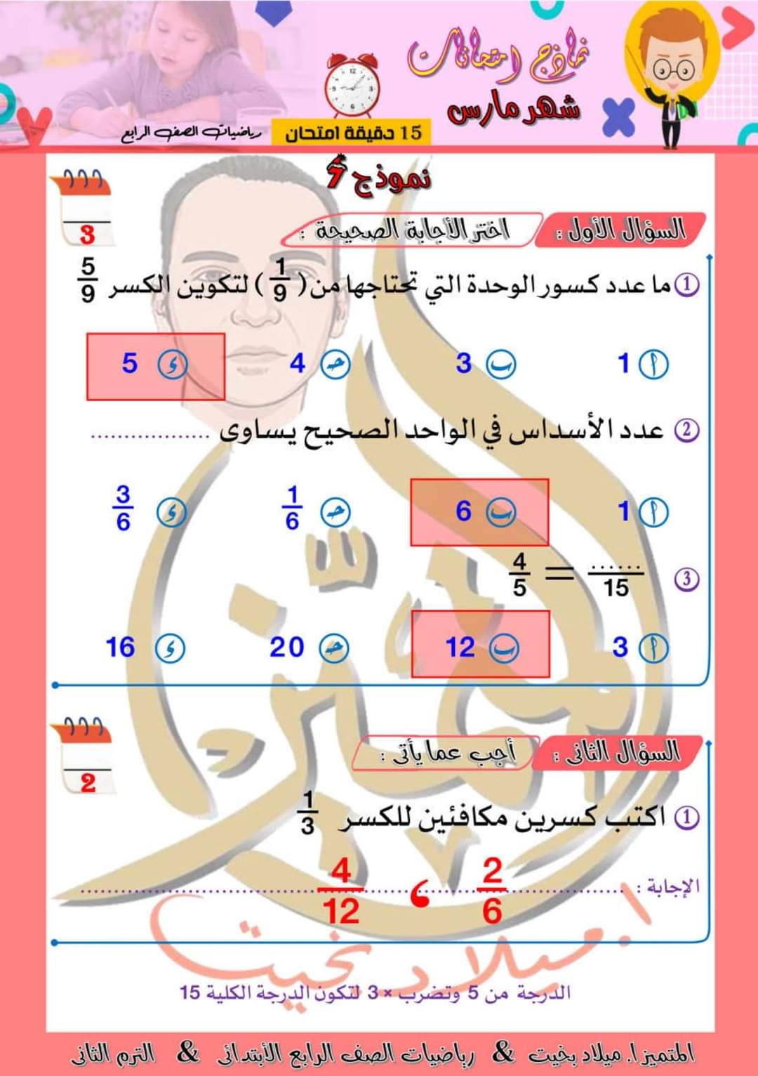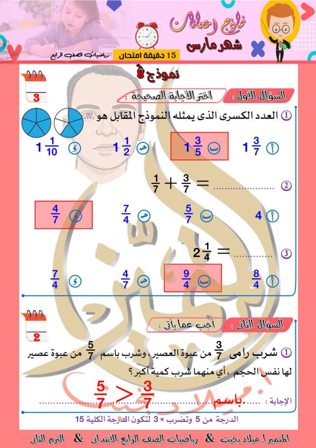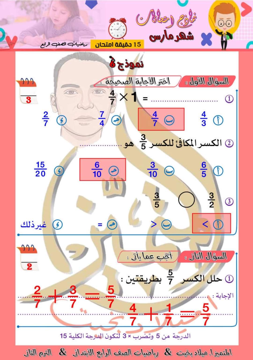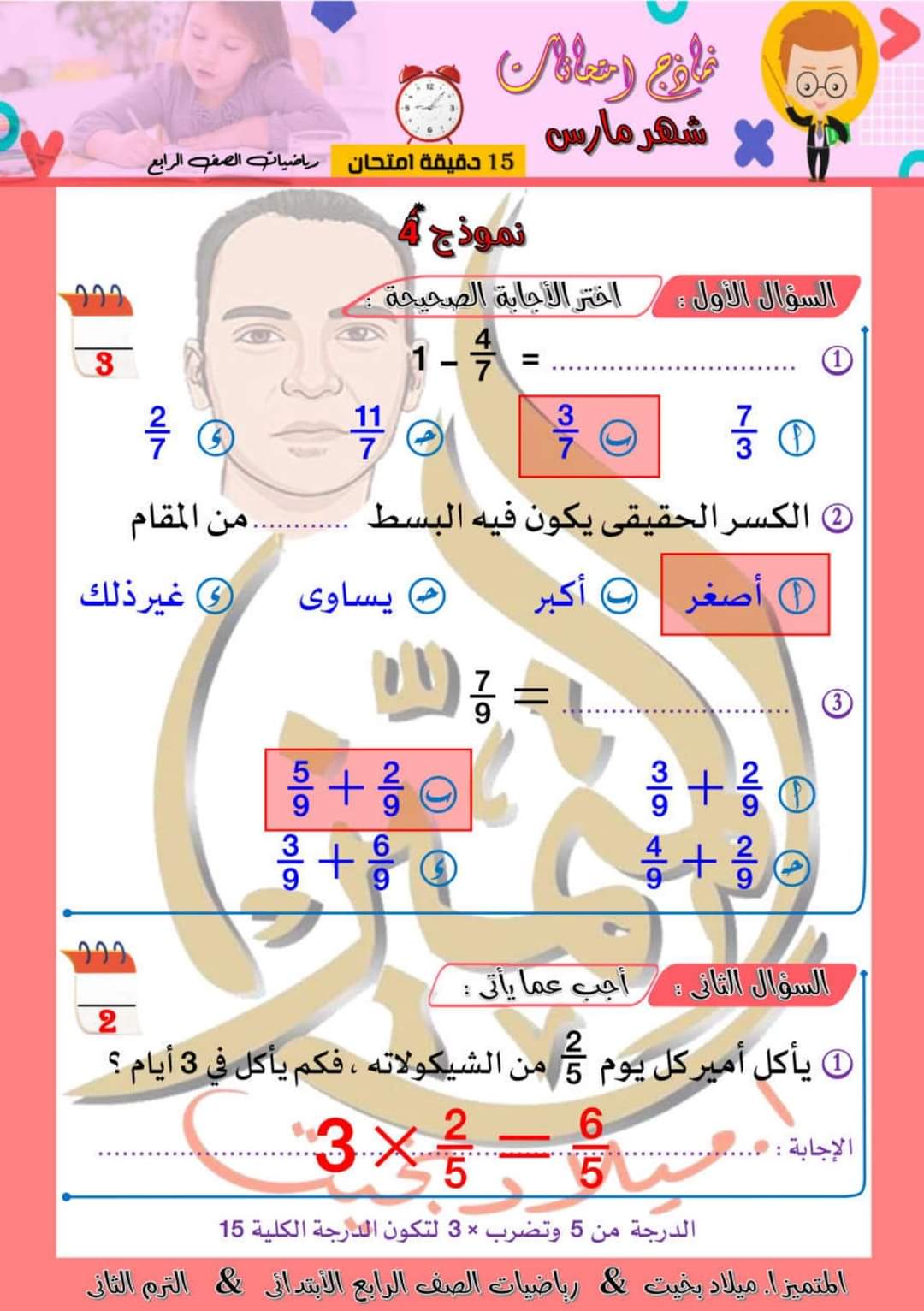 نماذج اختبارات رياضيات الصف الرابع الابتدائي مقرر مارس بالحل