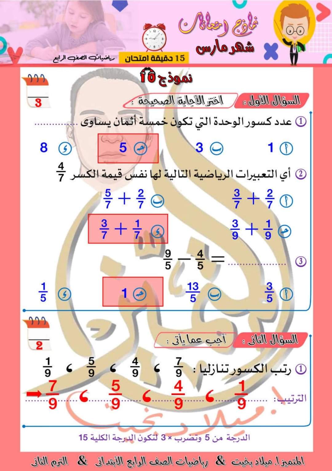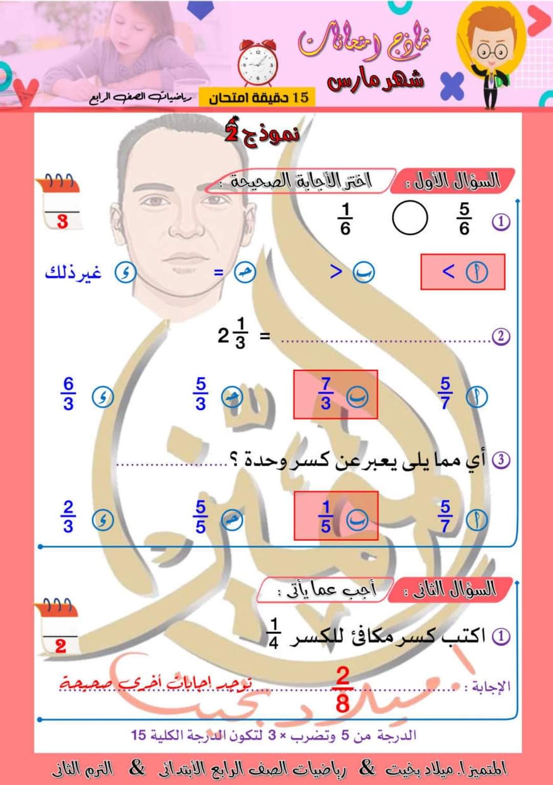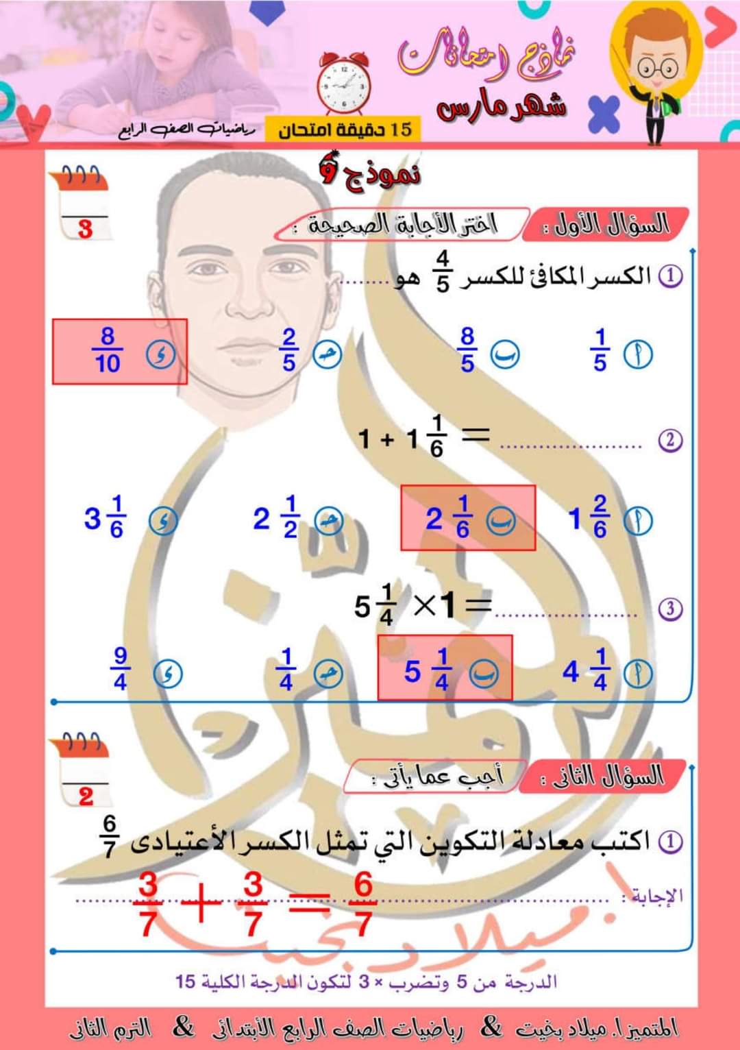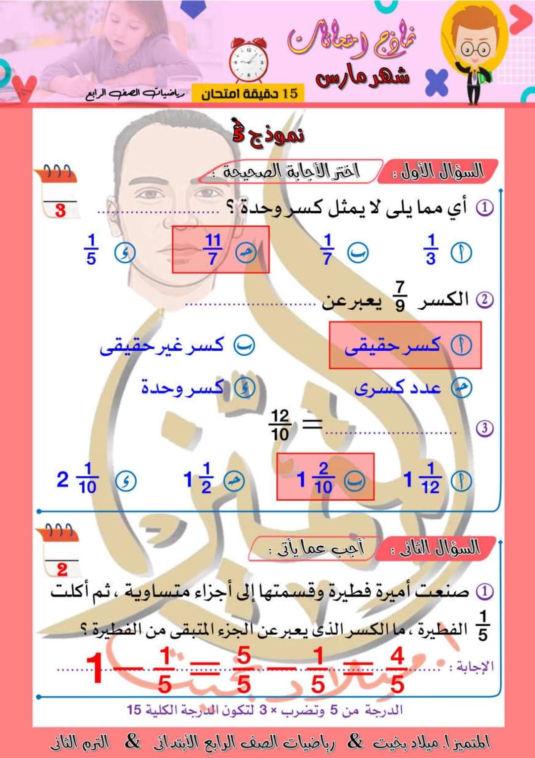 نماذج اختبارات رياضيات الصف الرابع الابتدائي مقرر مارس بالحل