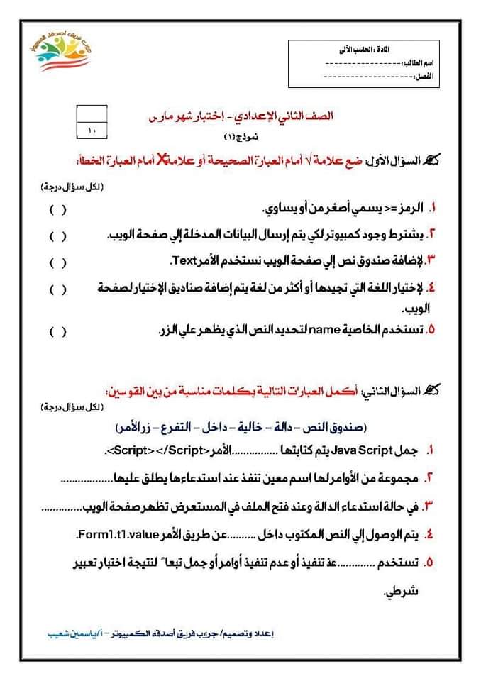 تحميل نماذج اختبارات مارس حاسب آلي الصف الثاني الاعدادي