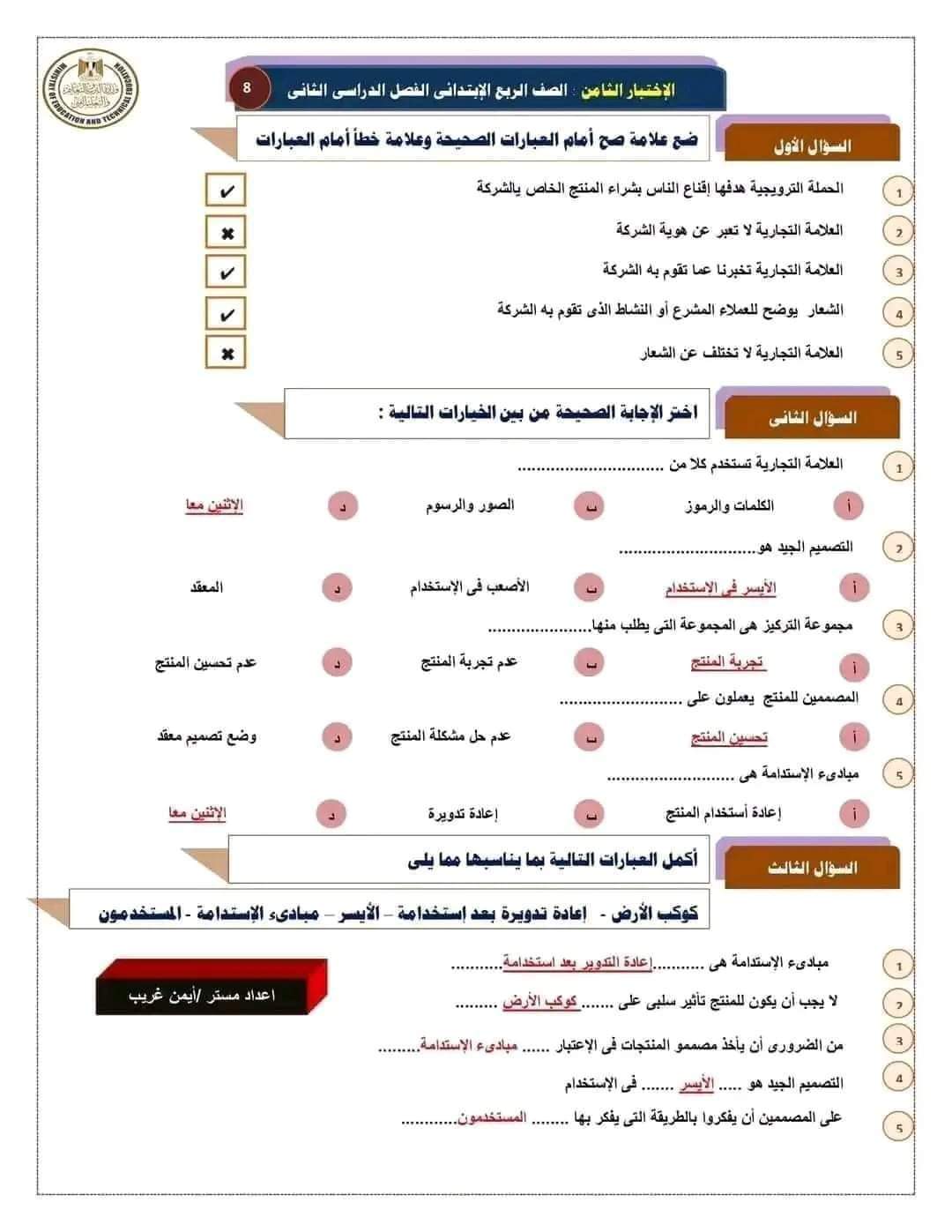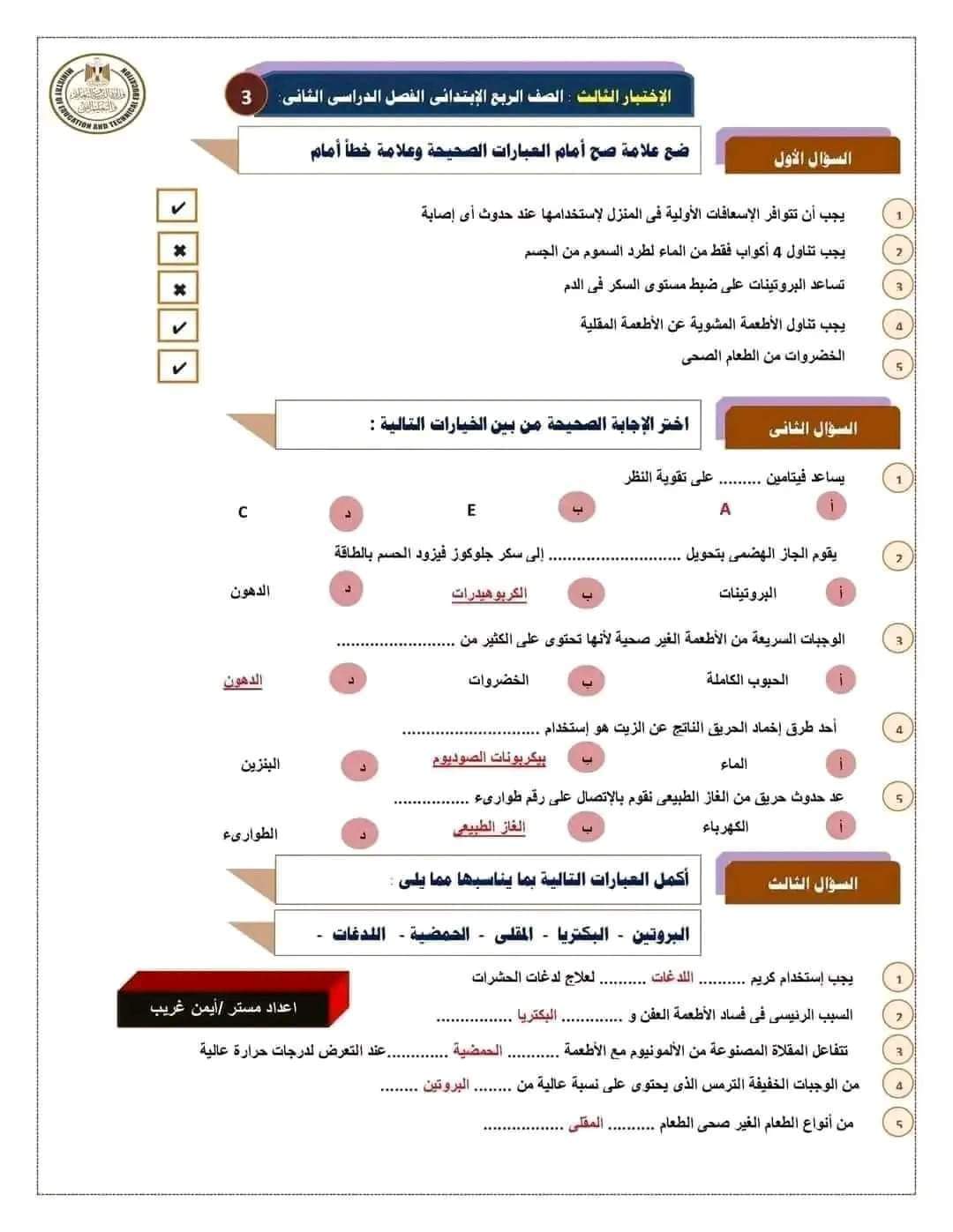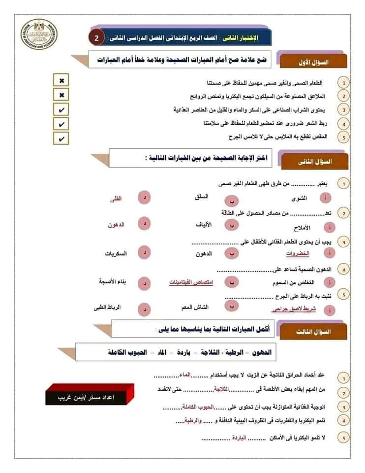 مراجعة بالاجابات اختبارات مهارات مهنية للصف الرابع الابتدائي لن يخرج عنها الامتحان