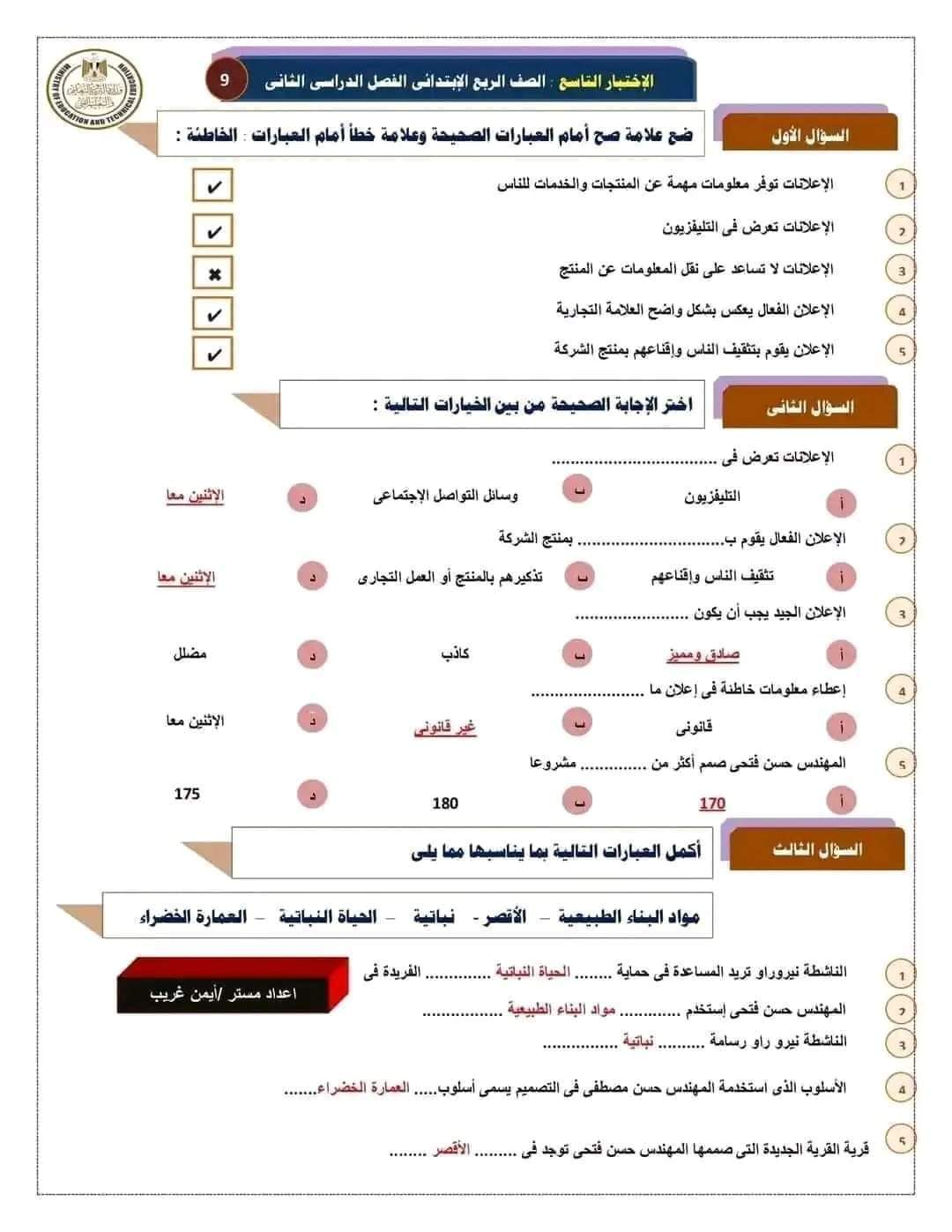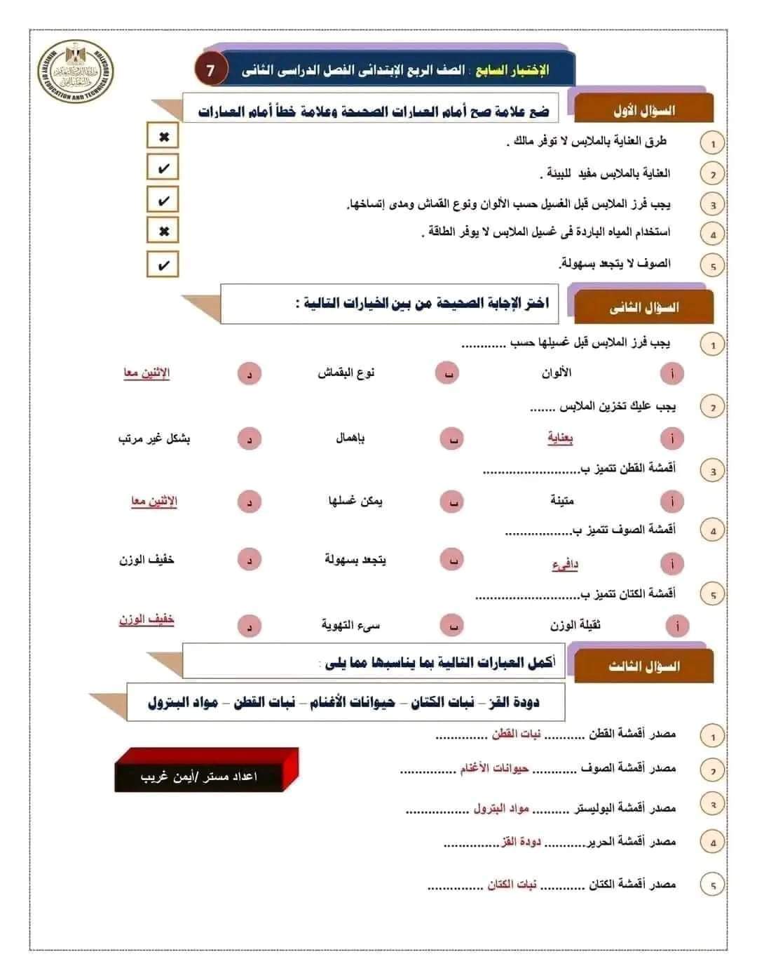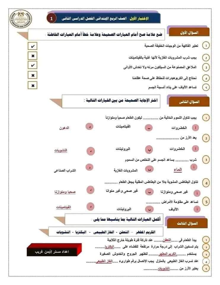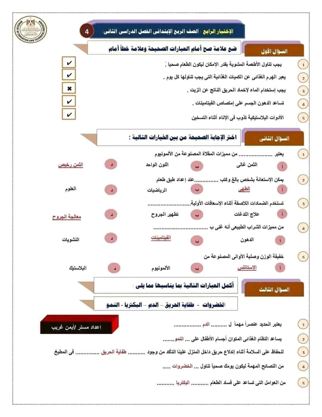 مراجعة بالاجابات اختبارات مهارات مهنية للصف الرابع الابتدائي لن يخرج عنها الامتحان