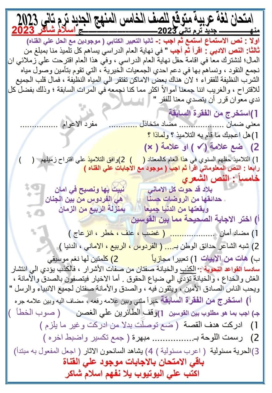 تحميل اختبار لغة عربية متوقع للصف الخامس الابتدائي الترم الثاني حسب المواصفات الجديدة الرسمية
