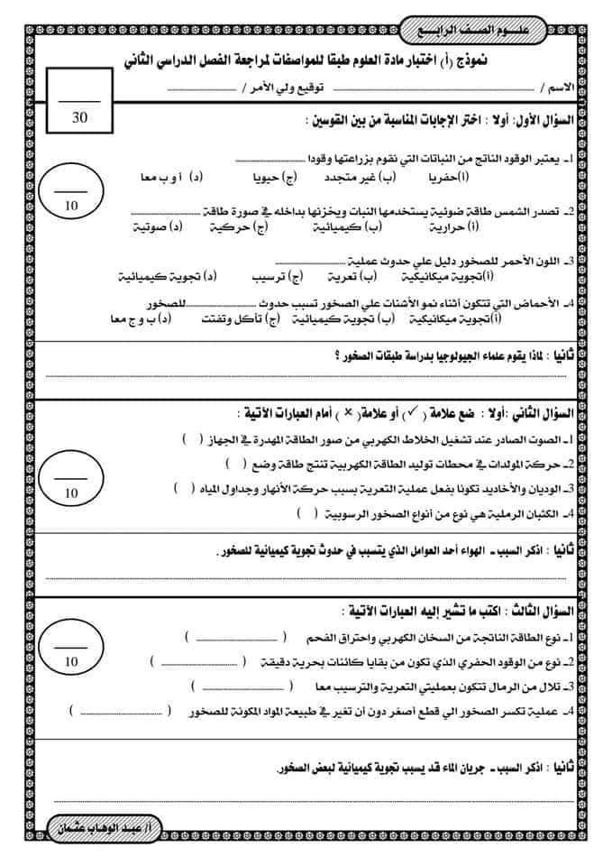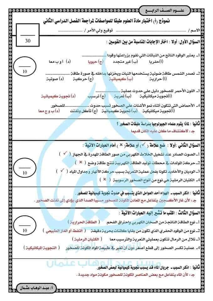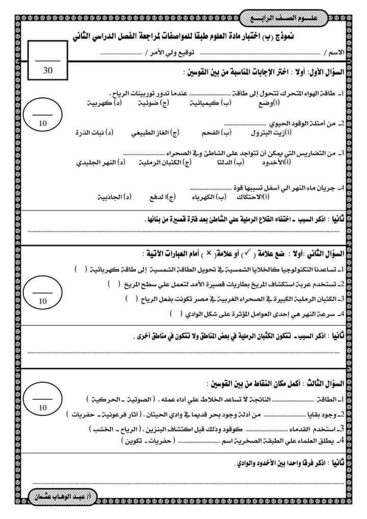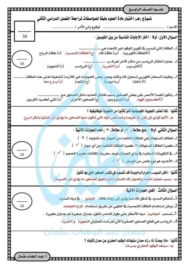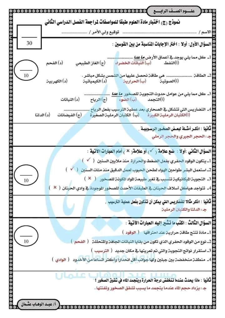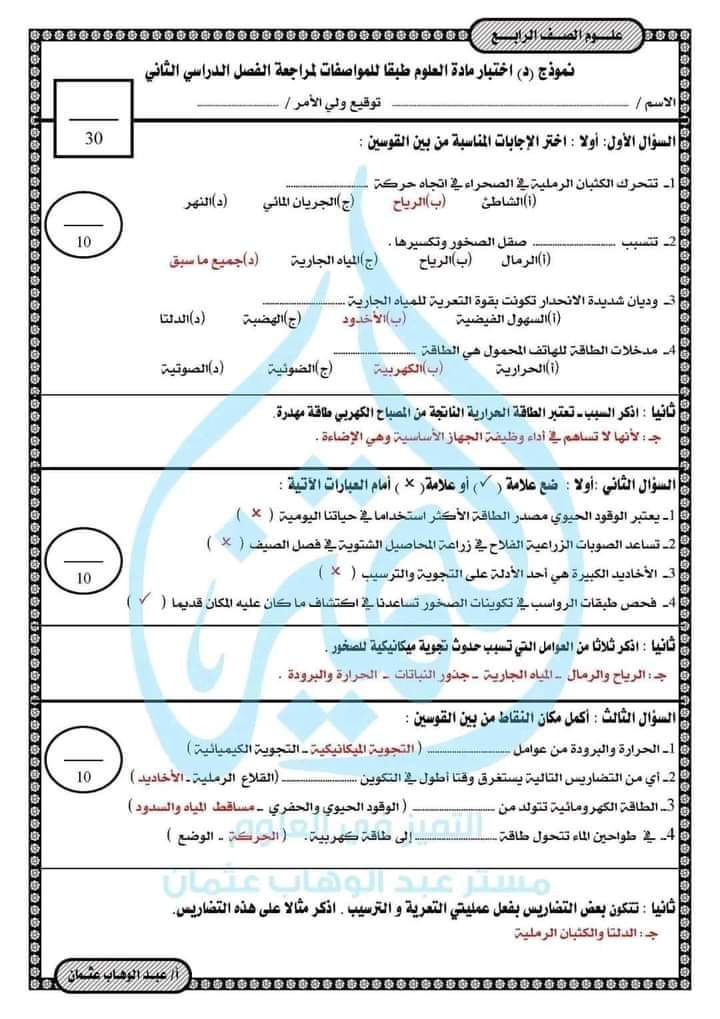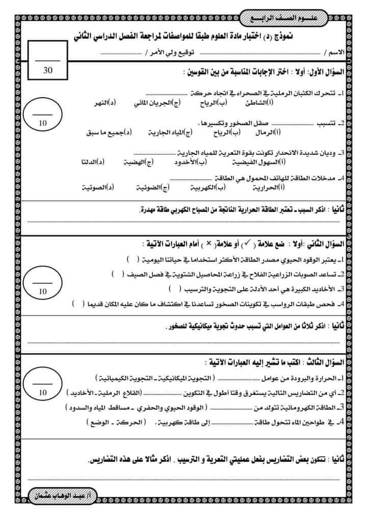 تحميل امتحانات حسب المواصفات علوم للصف الرابع الابتدائي الترم التاني مع الإجابة