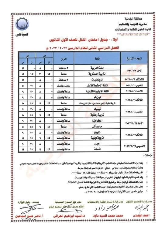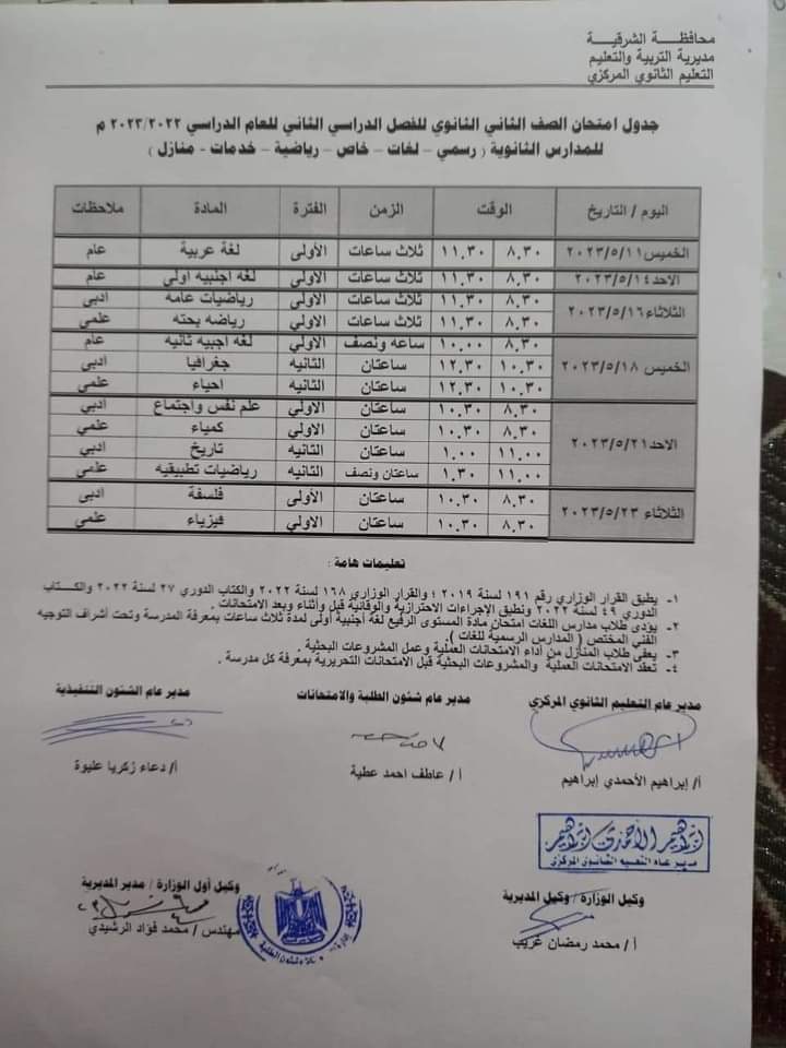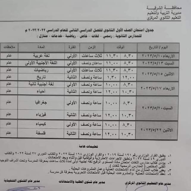 جدول امتحانات الترم الثاني 2023 للصفين الاول والثاني الثانوي محافظة الشرقية
