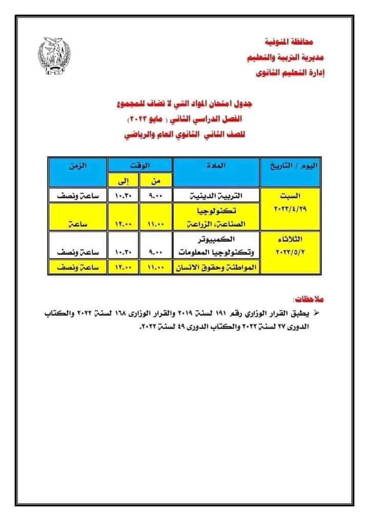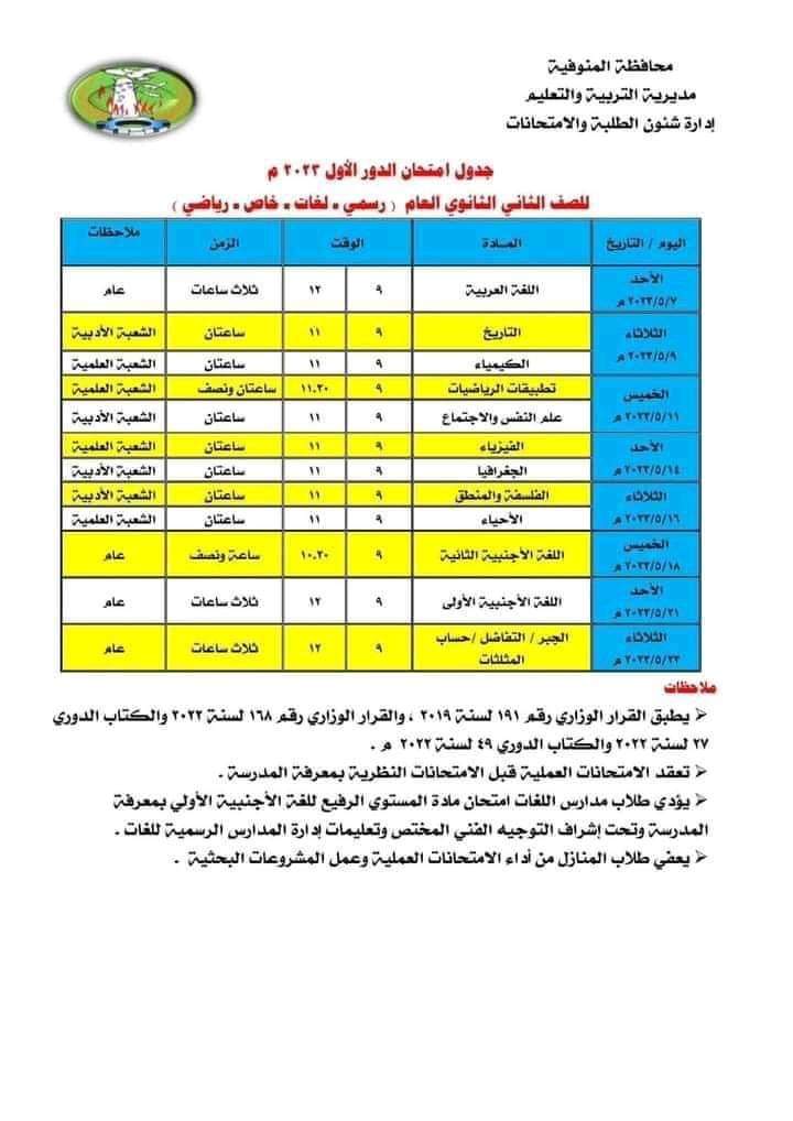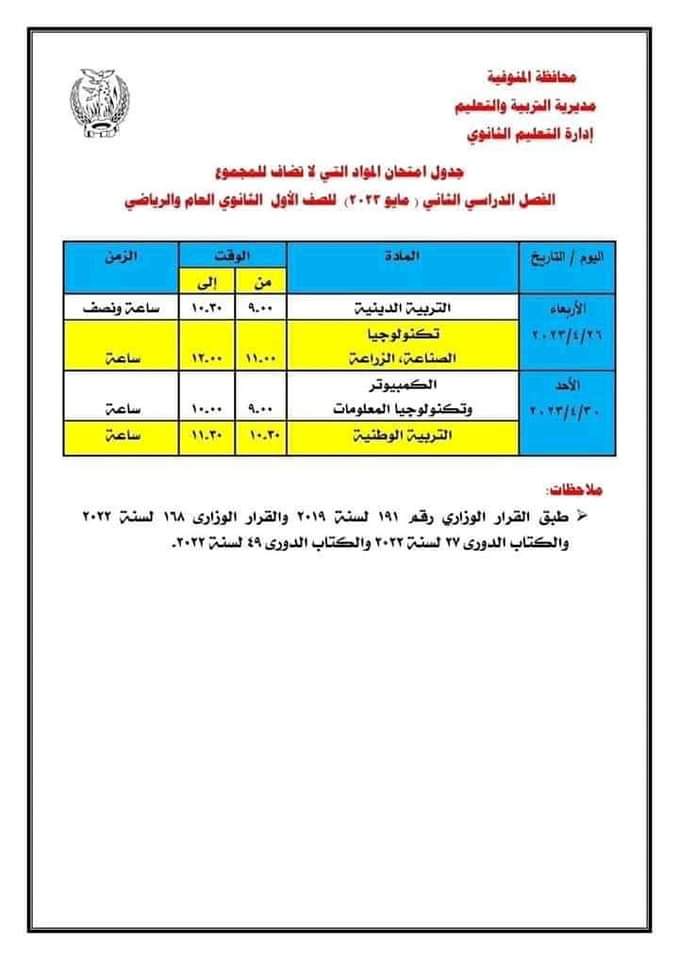 جدول امتحانات الترم الثاني 2023 للصفين الاول والثاني الثانوي محافظة المنوفية
