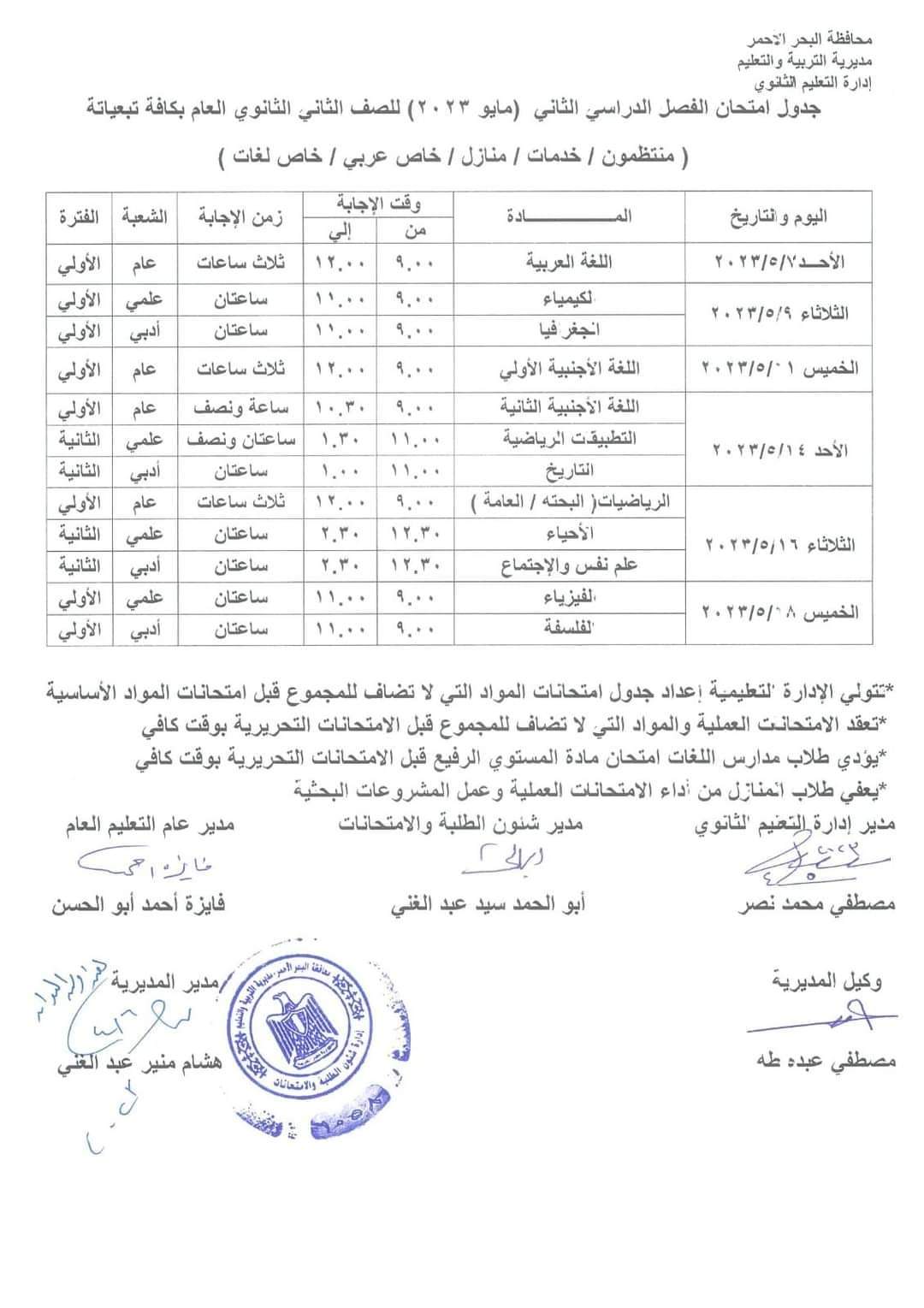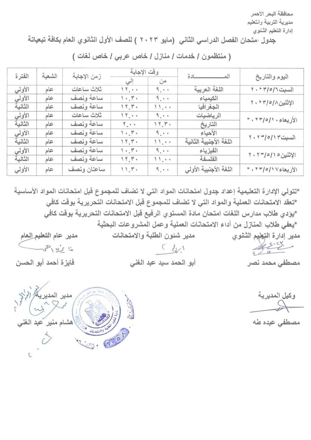 جدول امتحانات الترم الثاني 2023 للصفين الاول والثاني الثانوي محافظة البحر الاحمر