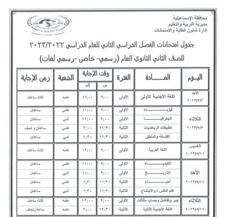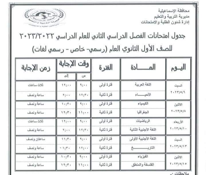 جدول امتحانات الترم الثاني 2023 للصفين الاول والثاني الثانوي محافظة الإسماعيلية