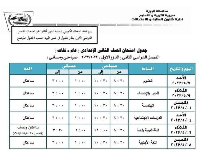 جداول امتحانات الفصل الدراسي الثانى الدور الأول ” أخر العام” للعام الدراسى 2022 /2023 بتعليم الجيزة