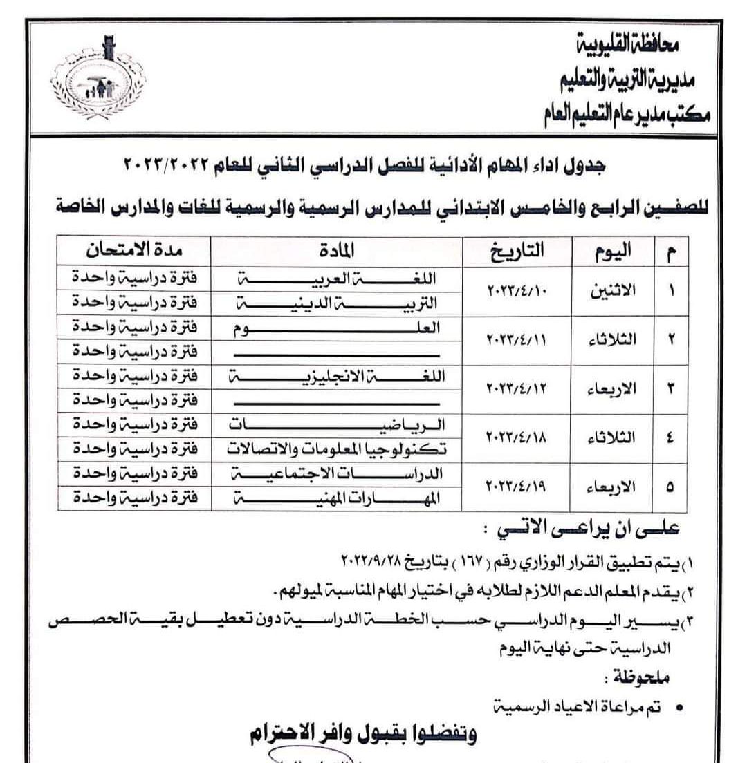 تحميل جدول أداء المهام الادائية للصفين الرابع والخامس الابتدائي محافظه القليوبيه الترم الثاني