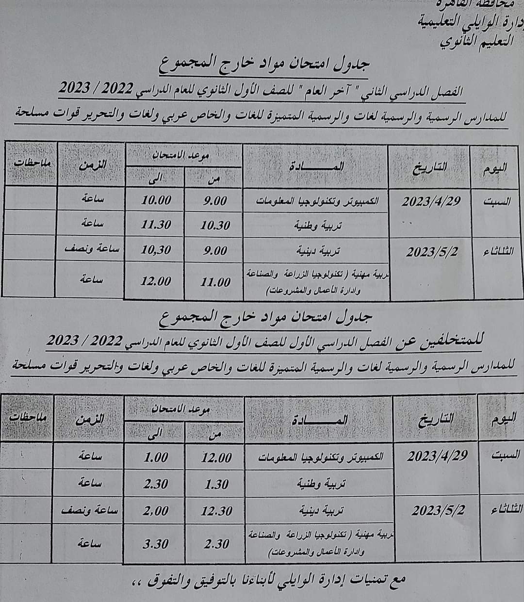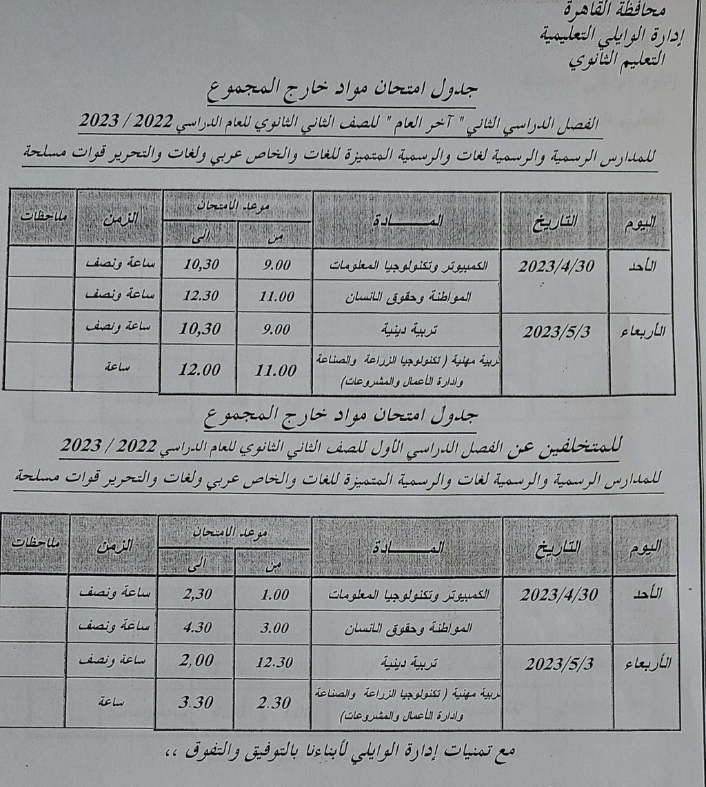 تحميل جدول امتحانات الصف الأول و الثاني الثانوي محافظة القاهرة الترم الثاني 2023