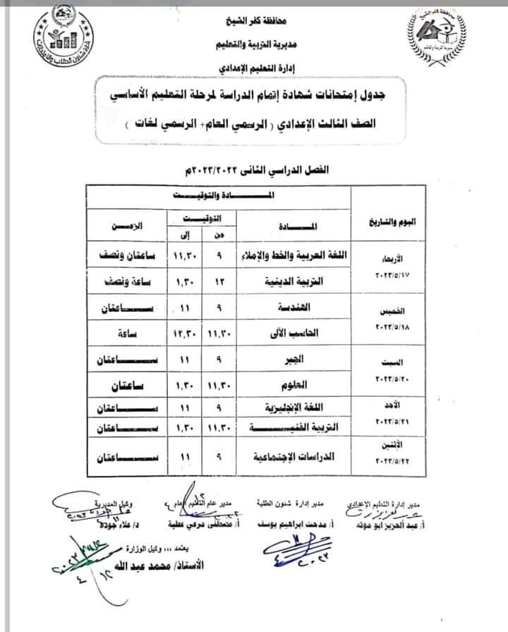 تحميل جدول امتحانات محافظة كفر الشيخ للشهادة الإعدادية الترم الثاني ٢٠٢٣