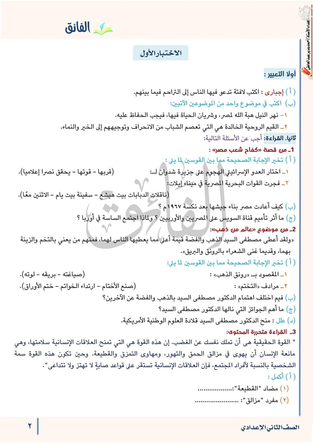 اختبارات الفائق لغة عربية للصف الثاني الإعدادي بإجابة النحو