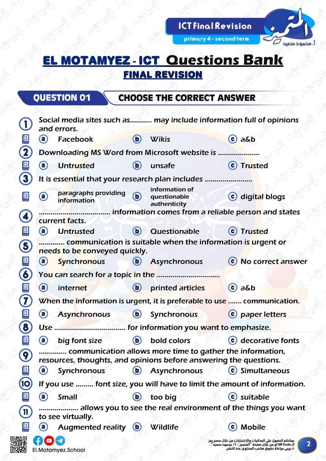مراجعة المتميز النهائية علي مقررات الفصل الدراسي الثاني بالكامل بدون اجزاء الاطلاع في مادة تكنولوجيا المعلومات لغات للصف الرابع الابتدائي ..