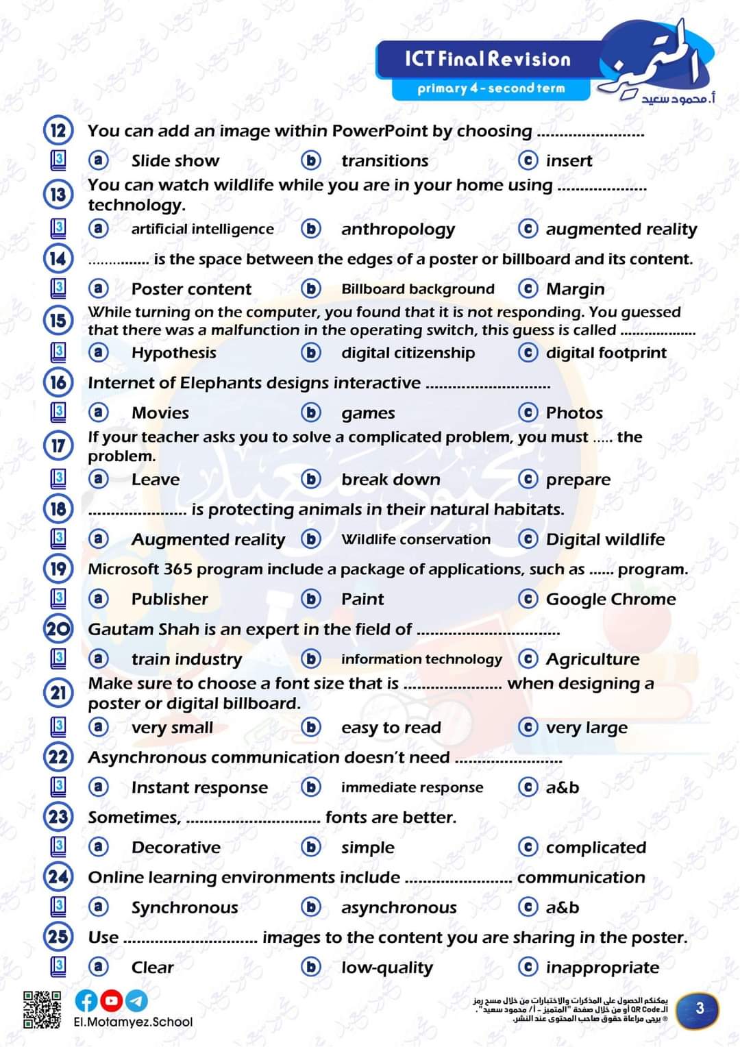تم تمييز اسئلة ( مقرر مارس ) بوضع شعار كتاب بداخله رقم 3 جوار السؤال …. باقي الاسئلة بدون شعار الكتاب غير مشمولة في اختبار شهر ابريل ..
