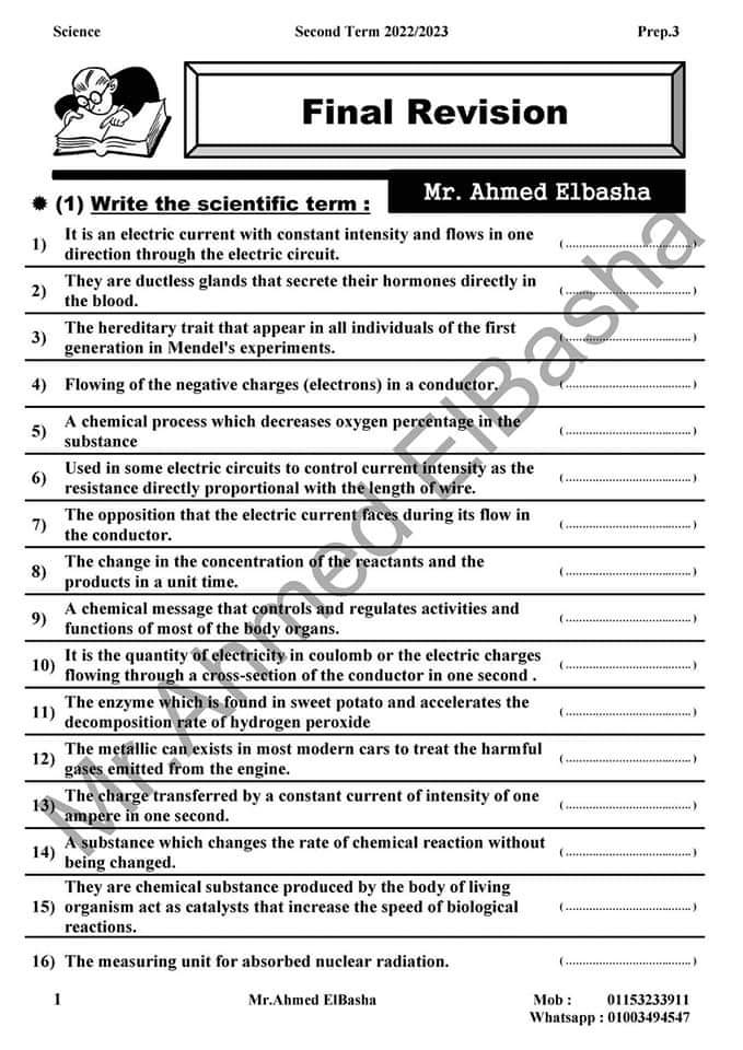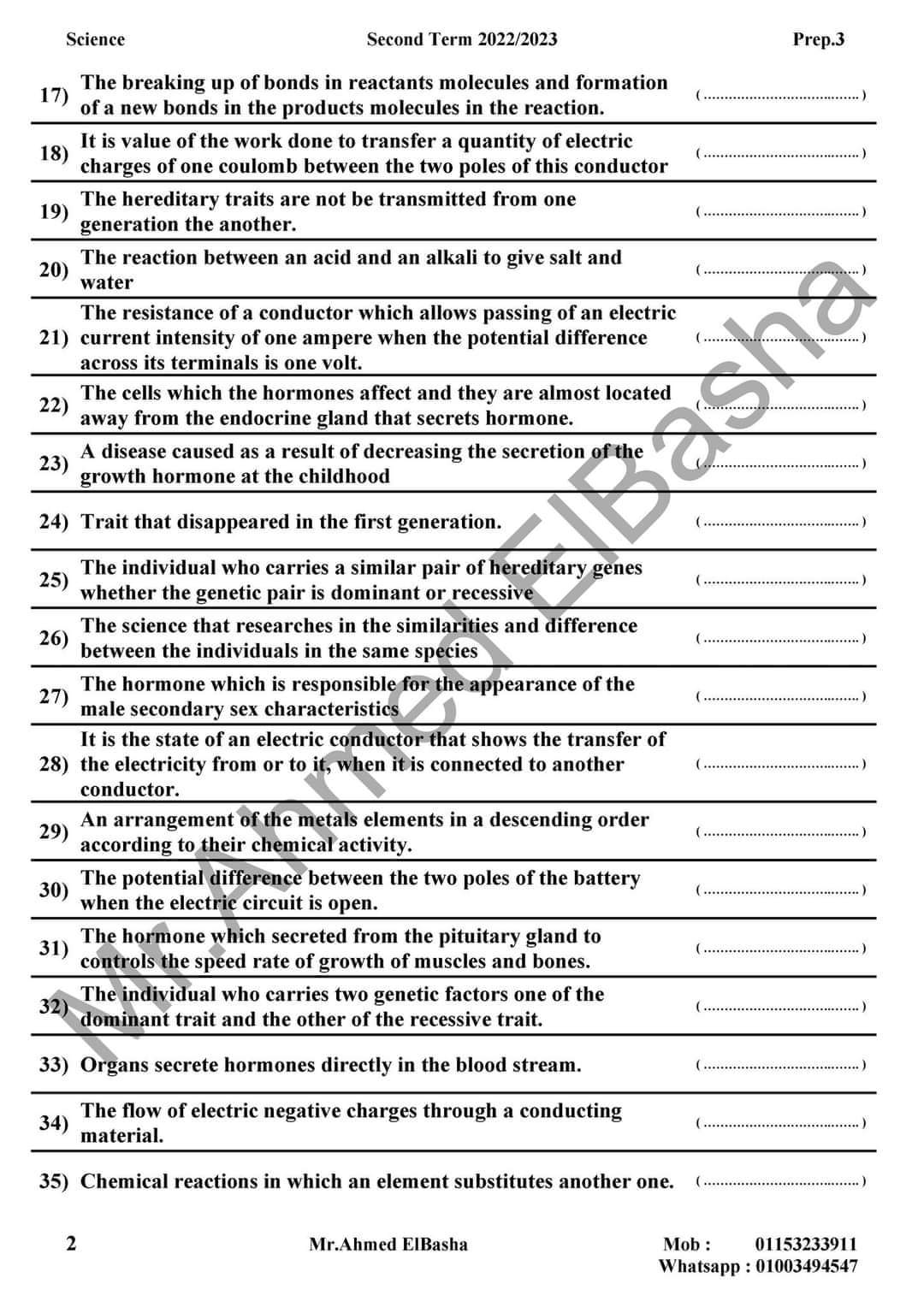 تحميل مراجعة ليلة الامتحان بالاجابات ساينس تالتة إعدادي الترم الثانى