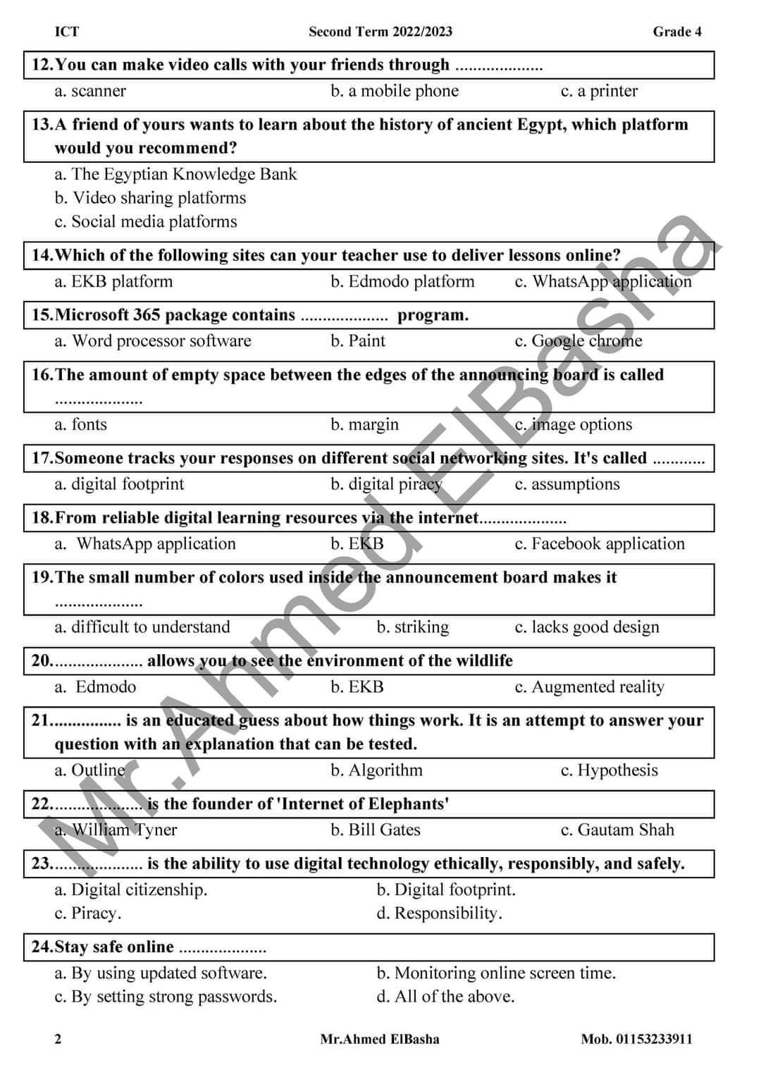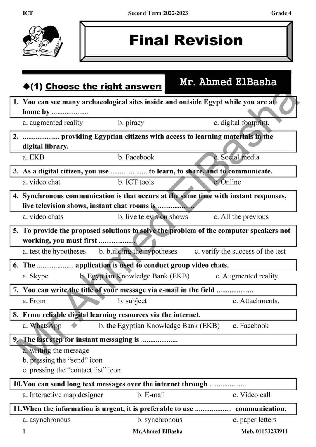تحميل مذكرة مراجعة ليلة الامتحان تكنولوجيا لغات رابعة ابتدائي الترم الثاني لمستر احمد الباشا