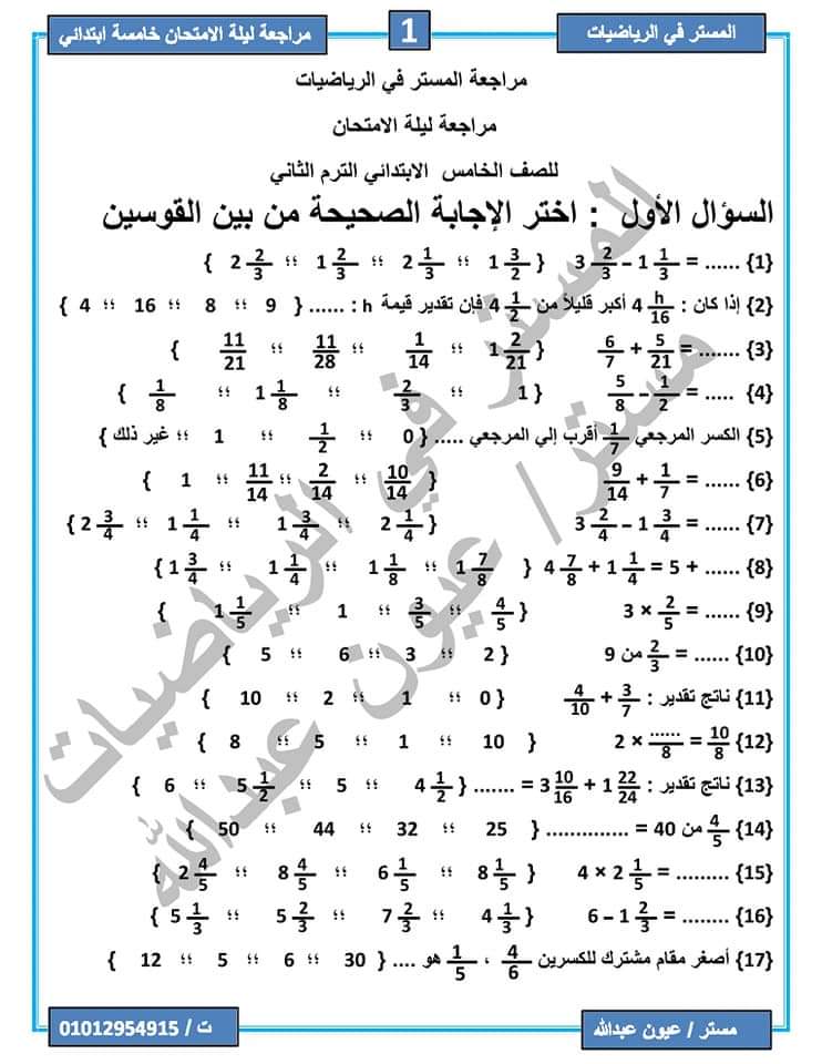 مراجعة ليلة الامتحان رياضيات للصف الخامس