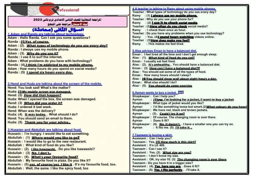 تحميل مراجعة ليلة الامتحان من بروفيشنال لغة انجليزية الصف الثاني الاعدادي الترم الثاني