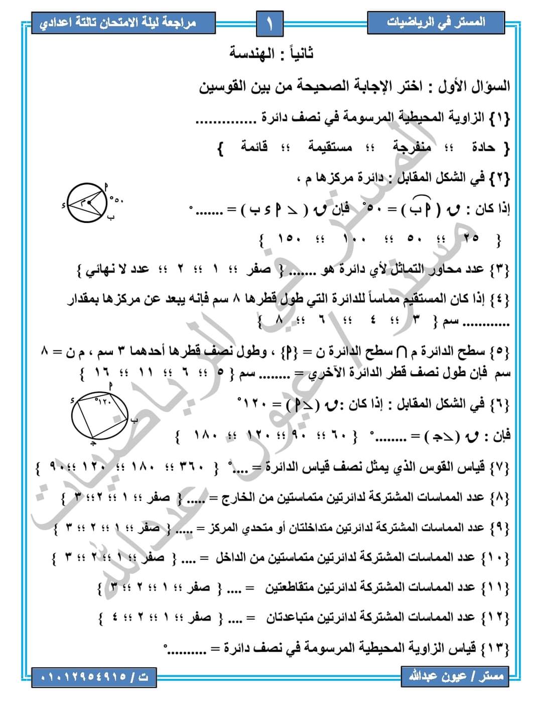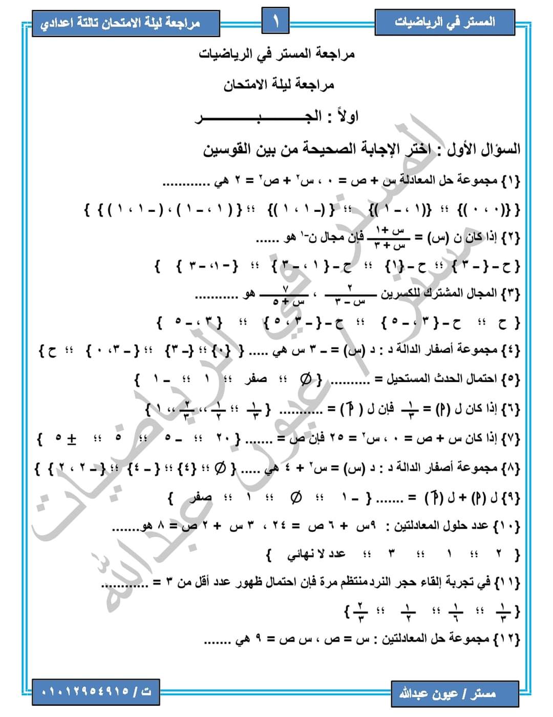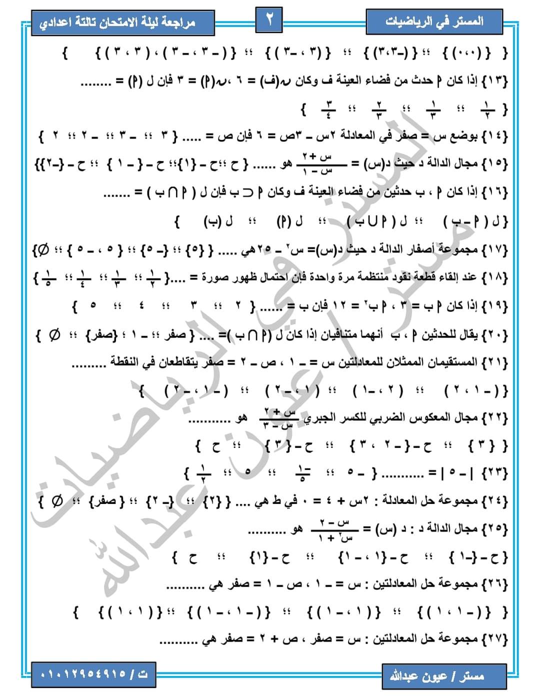 مراجعة رياضيات للصف الثالث الإعدادي / مستر عيون عبدالله