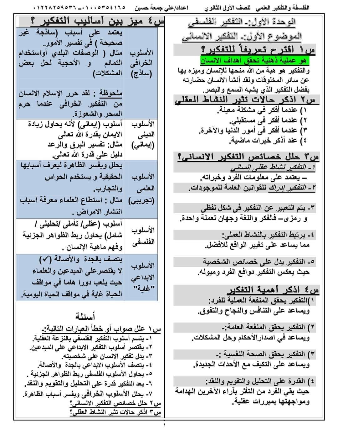 تحميل ملخص الفلسفة للصف الاول الثانوي الترم الثاني