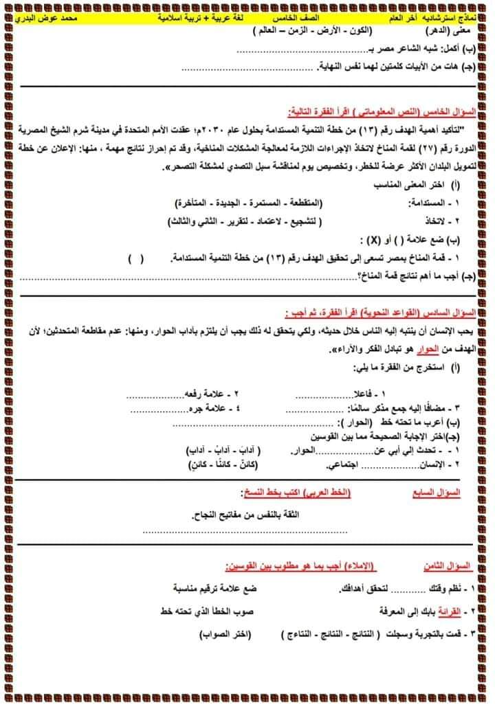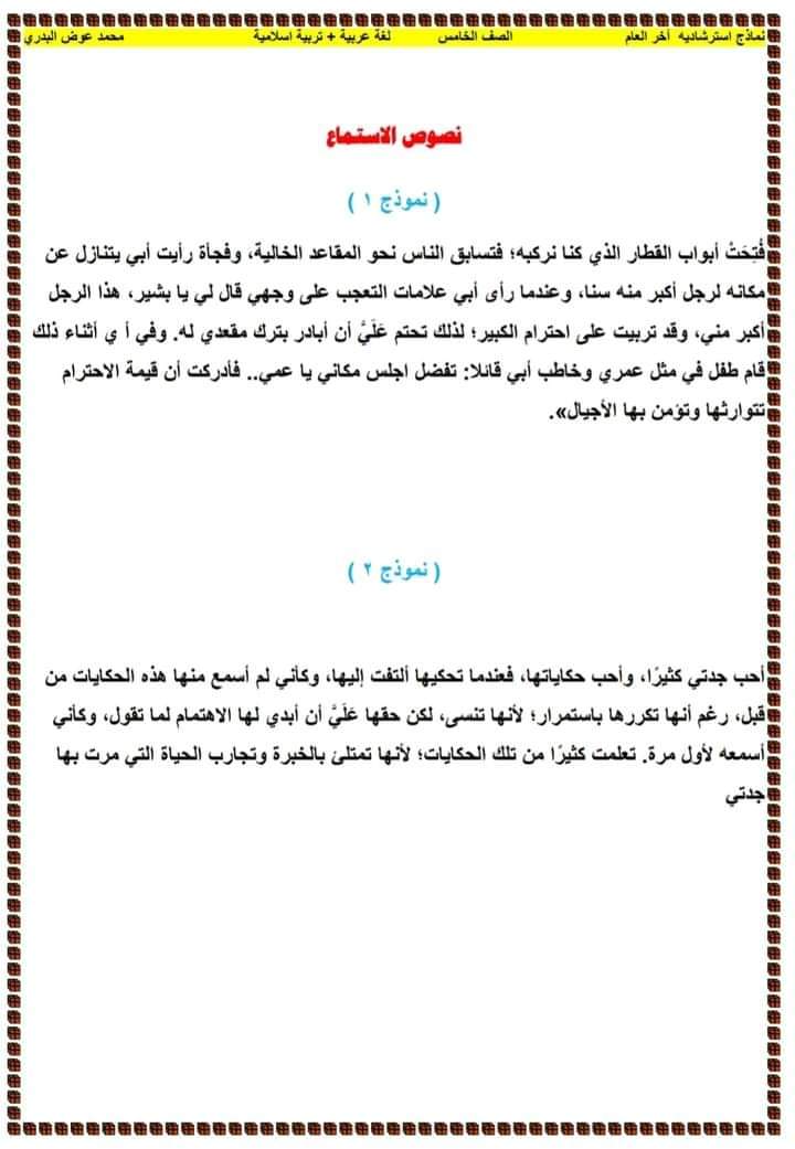 نماذج امتحانات استرشادية لغة عربية+ تربية إسلامية للصف الخامس الابتدائي الترم الثاني
