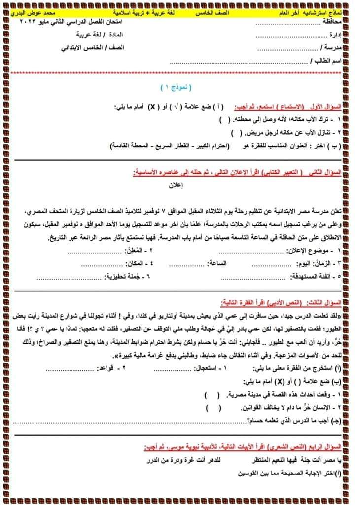 نماذج امتحانات استرشادية لغة عربية+ تربية إسلامية للصف الخامس الابتدائي الفصل الدراسي الثاني مرفق نماذج الإجابة رابط تحميل pdf من هنا