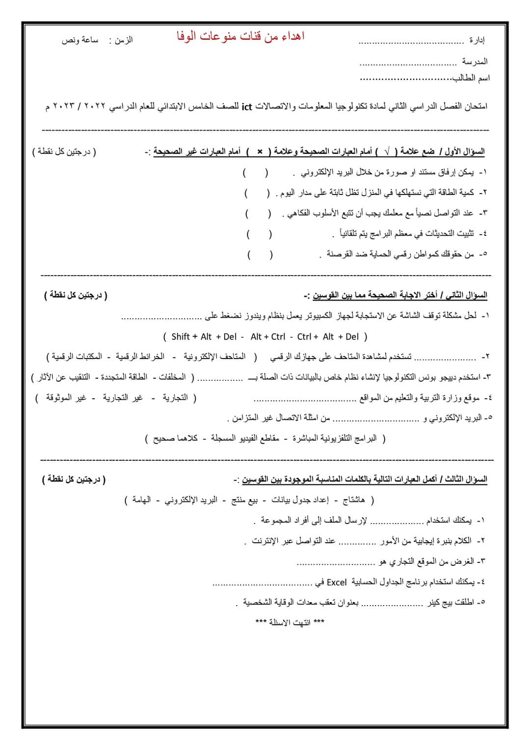 تحميل اختبار تكنولوجيا المعلومات والاتصالات متوقع لخامسة ابتدائي الترم الثاني 2023 حسب مواصفات الوزارة الجديدة