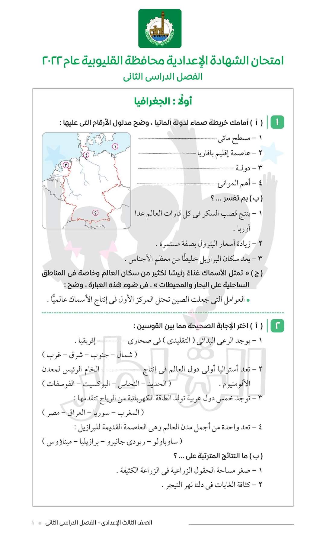 تحميل امتحان الدرسات الاجتماعية للشهادة الإعدادية محافظة القليوبية – الترم الثاني 2022 (مجاب عنه)
