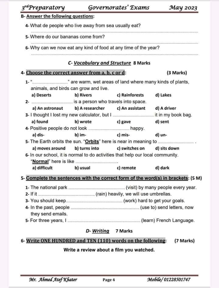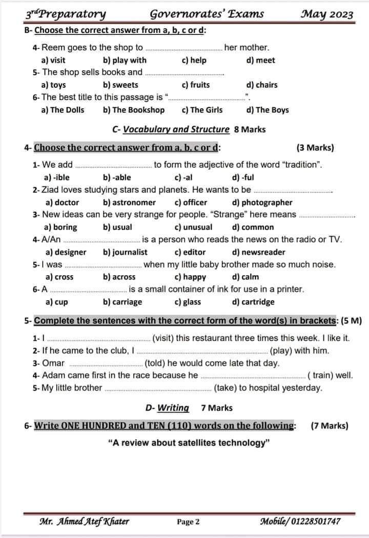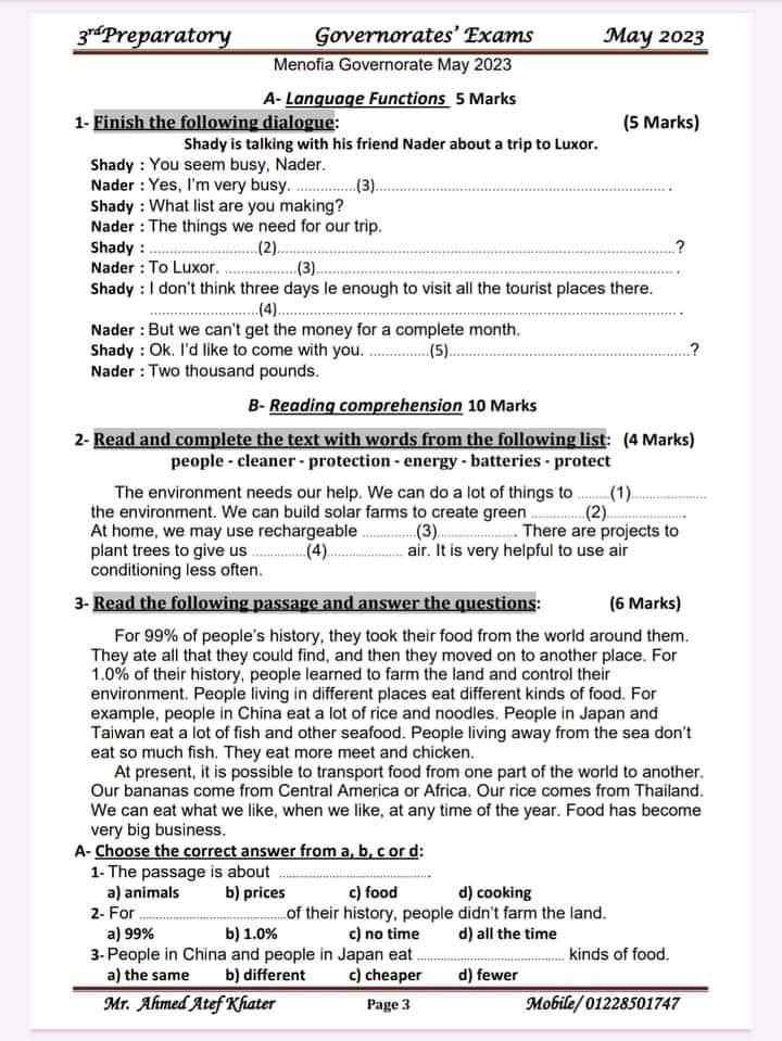 تحميل تجميع امتحانات الانجليزي للصف الثالث الاعدادي كل المحافظات الترم الثاني 2023