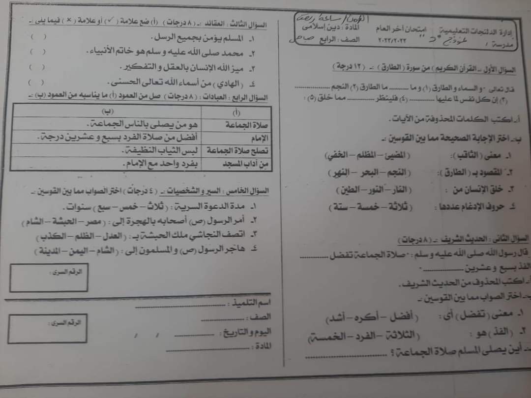 تجميع امتحانات اللغة العربية والدين للصف الرابع الابتدائي الترم الثاني 2023 محافظة البحيرة