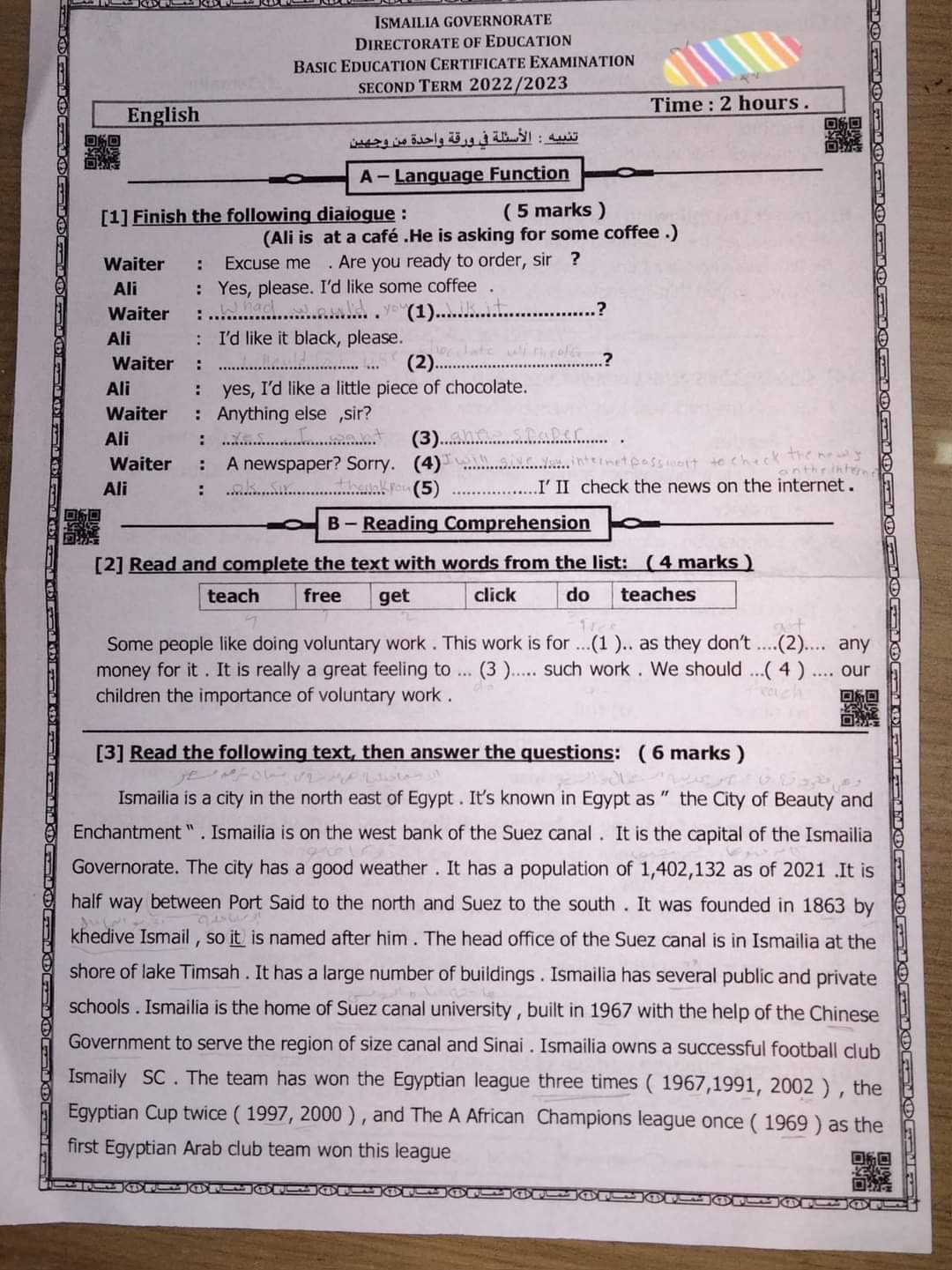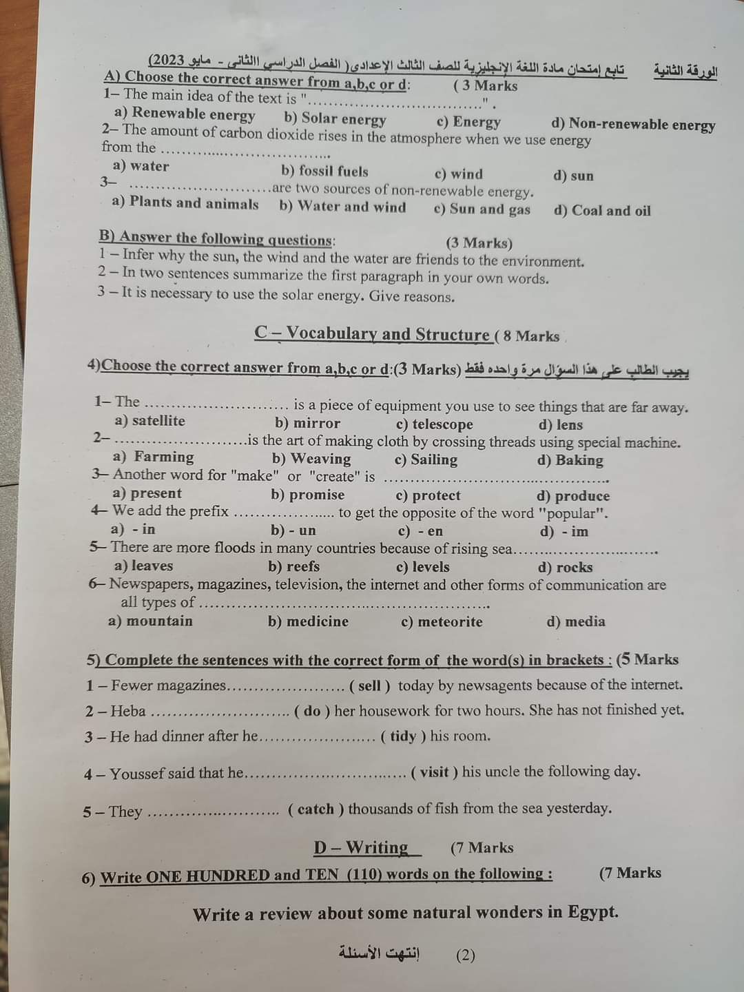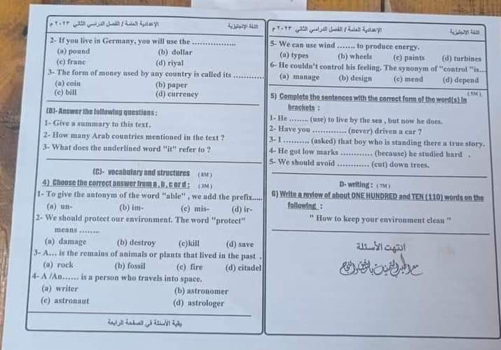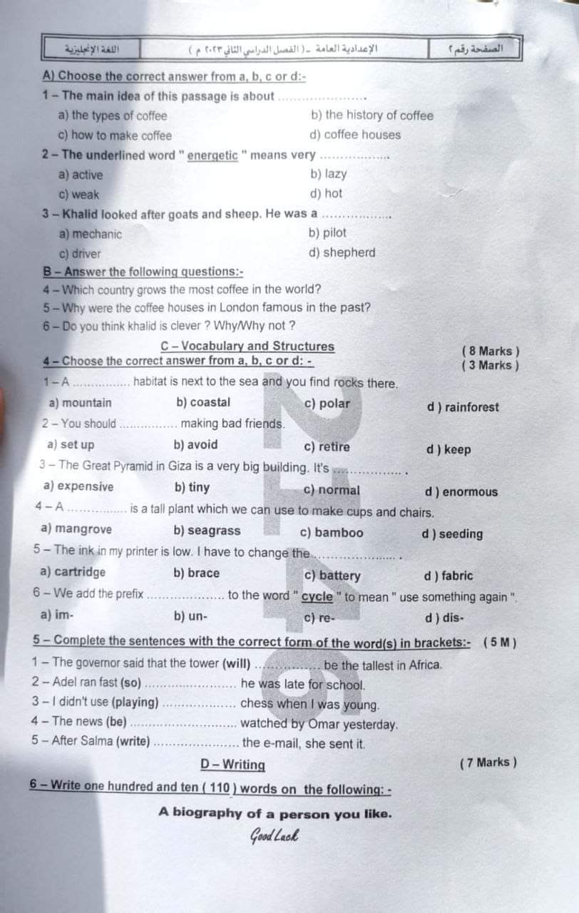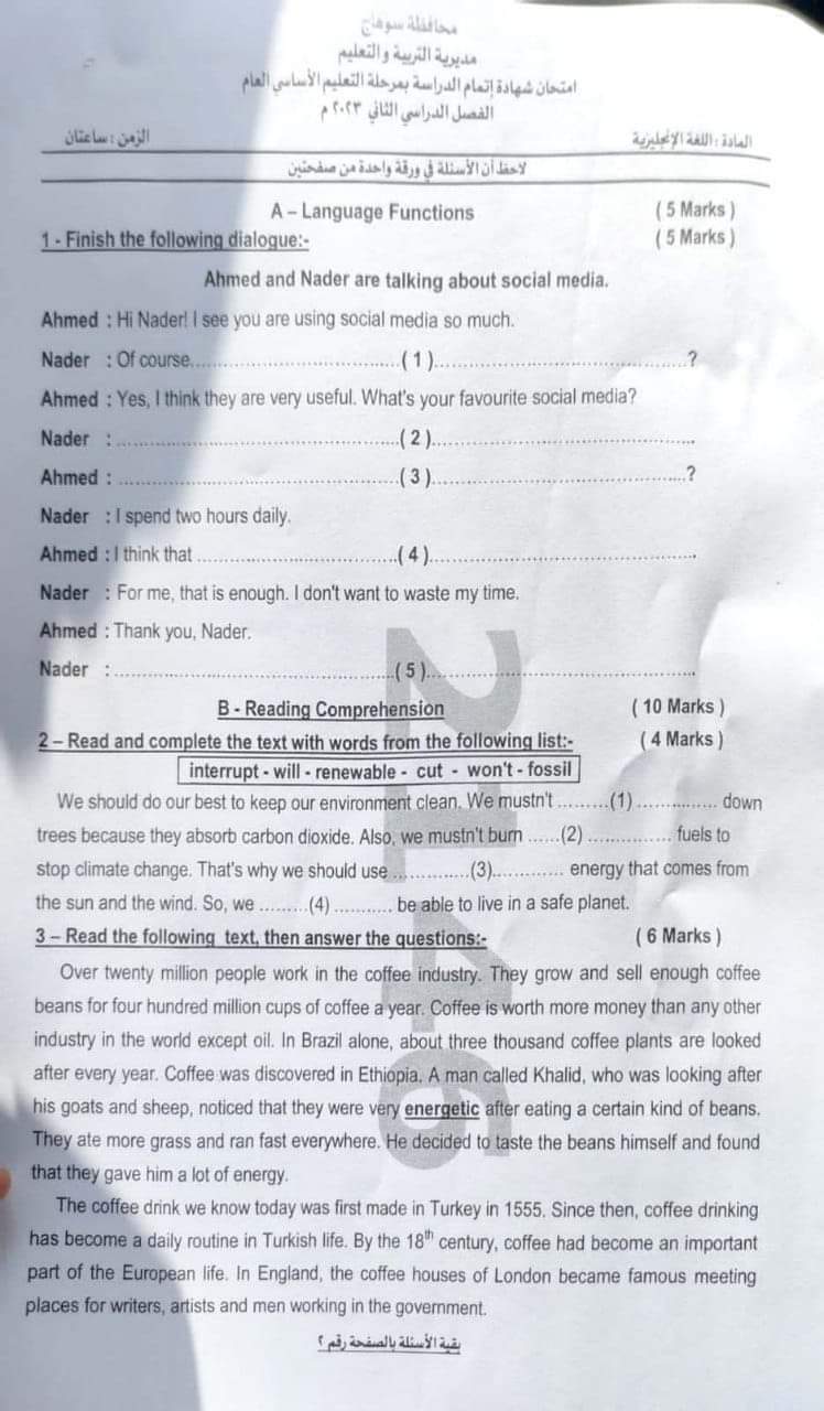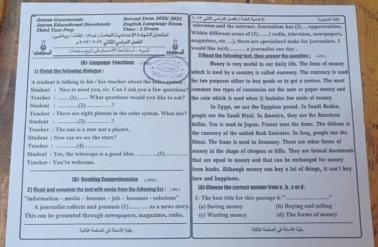 تحميل امتحانات اللغة الانجليزية محافظات الفيوم – اسوان – سوهاج – الاسماعيلية للشهادة الاعدادية الترم الثاني 2023
