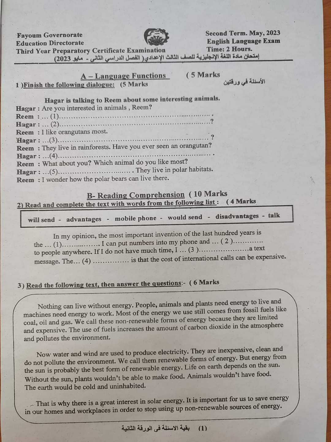 تحميل تحميل امتحانات اللغة الانجليزية محافظات الفيوم – اسوان – سوهاج – الاسماعيلية للشهادة الاعدادية الترم الثاني 2023