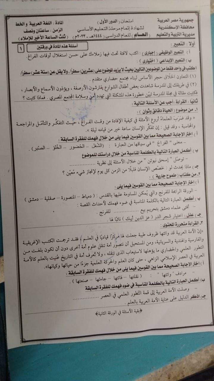 تحميل امتحان اللغة العربية محافظة الاسكندرية للصف الثالث الاعدادي الترم الثاني 2023