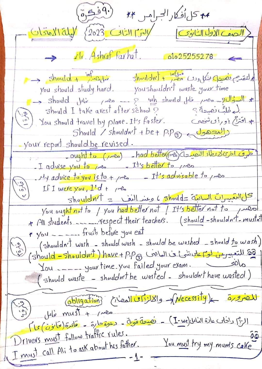 جميع افكار منهج الجرامر للصف الاول الثانوي الترم الثاني