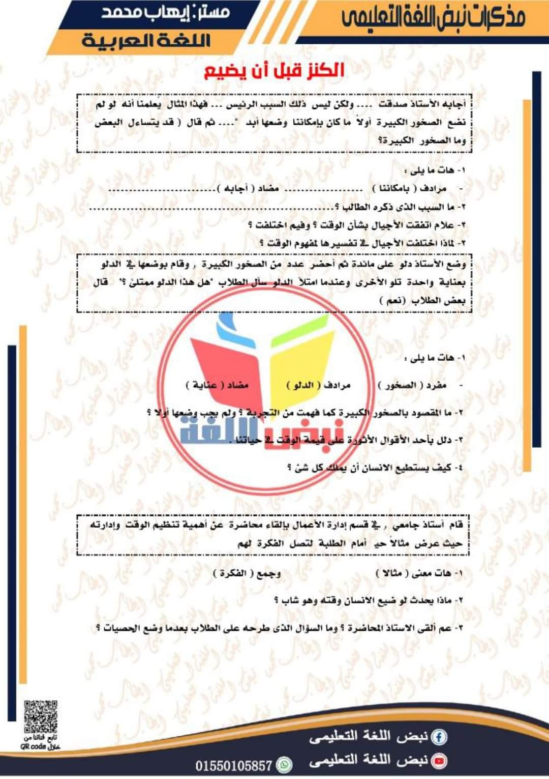 تحميل مذكرة مراجعة ليلة الامتحان عربي تانية اعدادي الترم الثاني