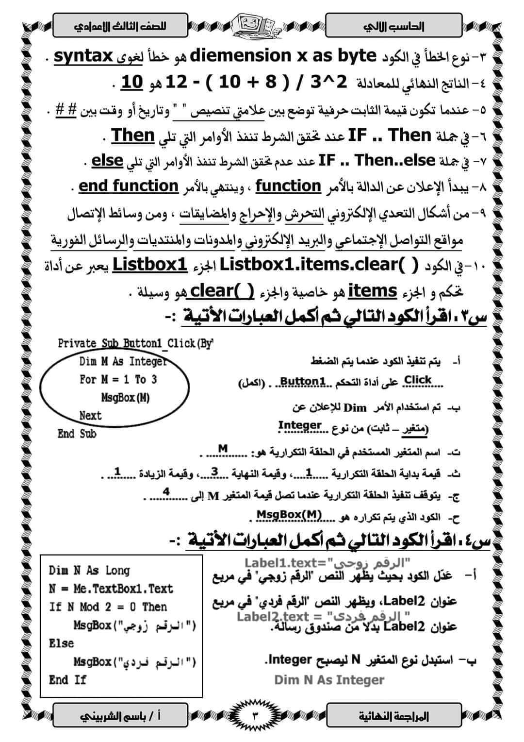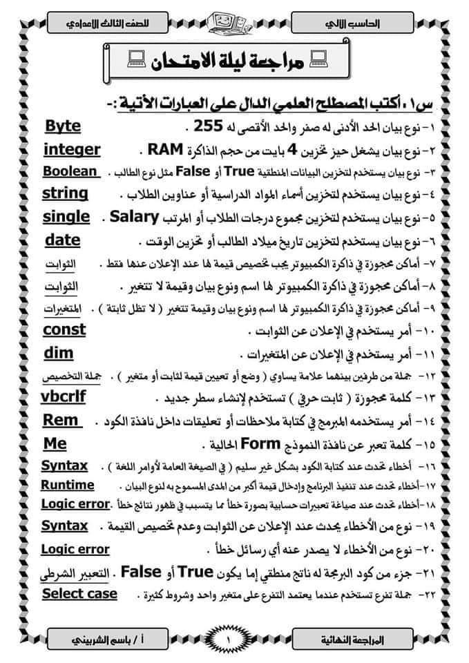 تحميل مذكرة مراجعة ليلة الامتحان كمبيوتر تالتة إعدادي الترم الثاني بالاجابات
