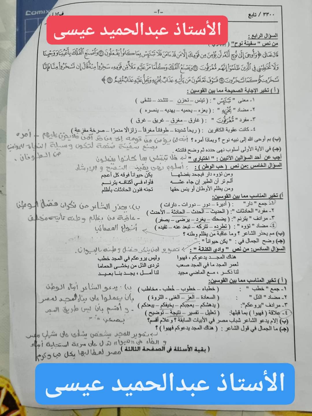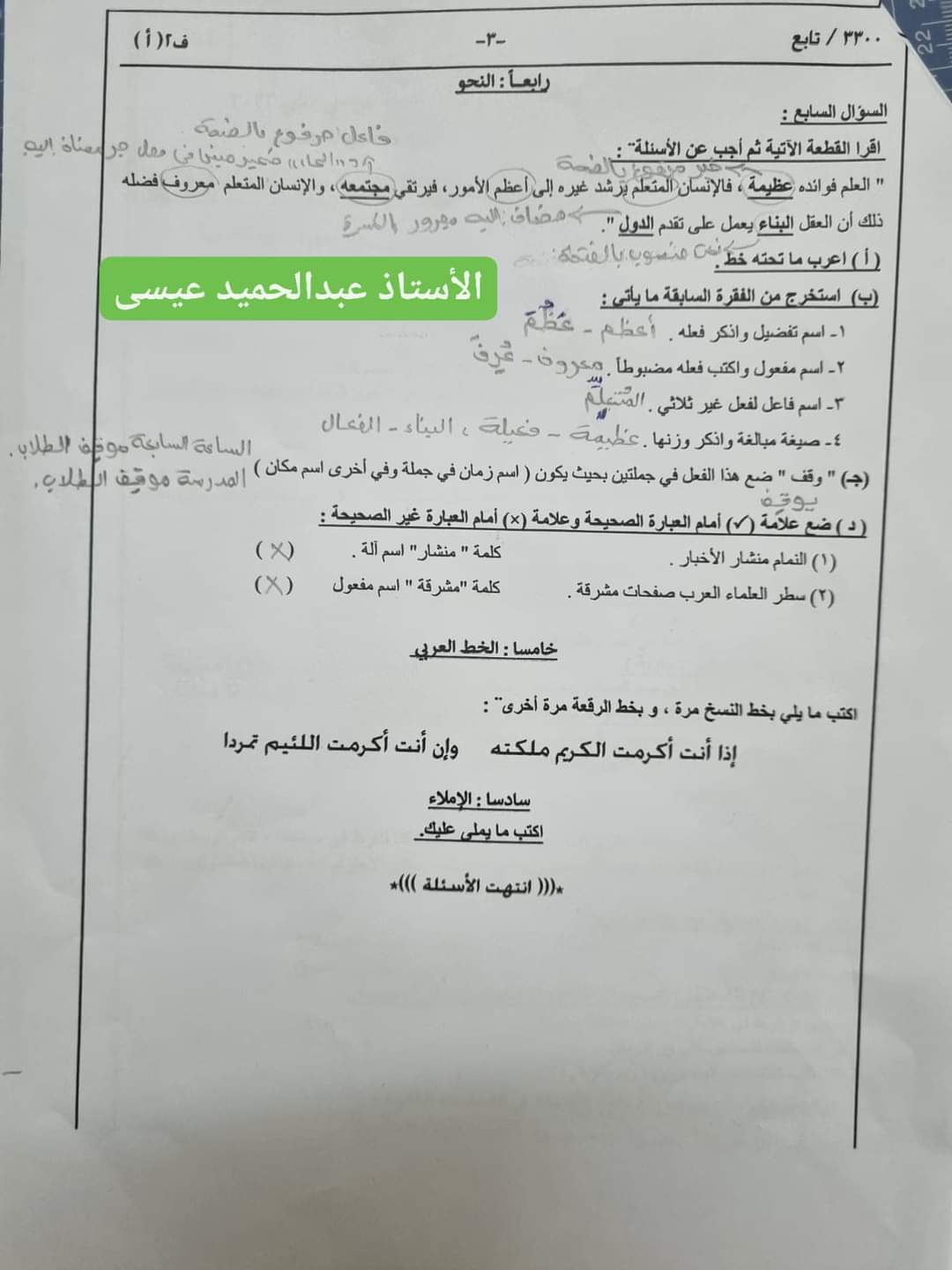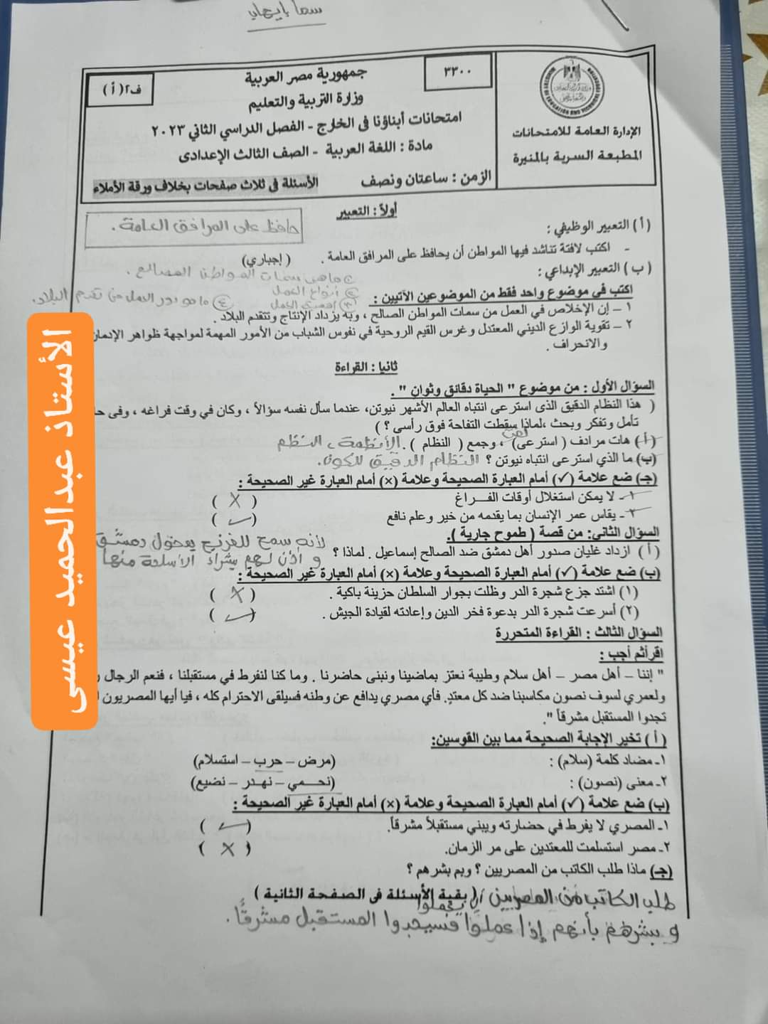 تحميل نموذج الاجابة الرسمي لامتحان اللغة العربية ابنائنا في الخارج تالتة اعدادي الترم الثاني 2023