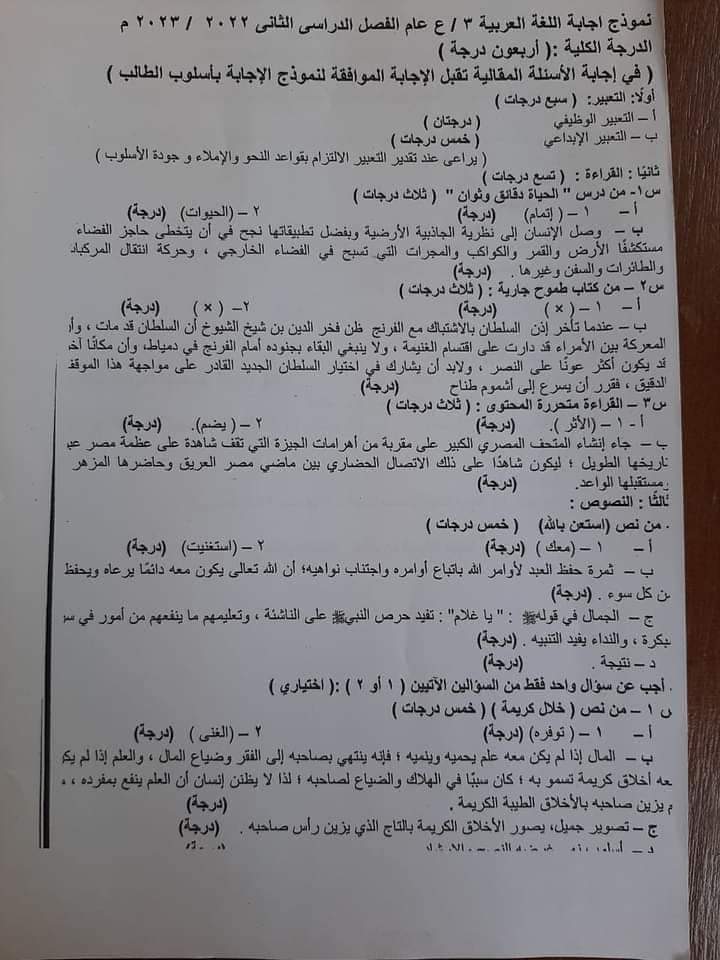 تحميل نموذج الاجابة الرسمي وتوزيع الدرجات لامتحان اللغة العربية محافظة القاهرة تالتة اعدادي الترم الثاني 2023