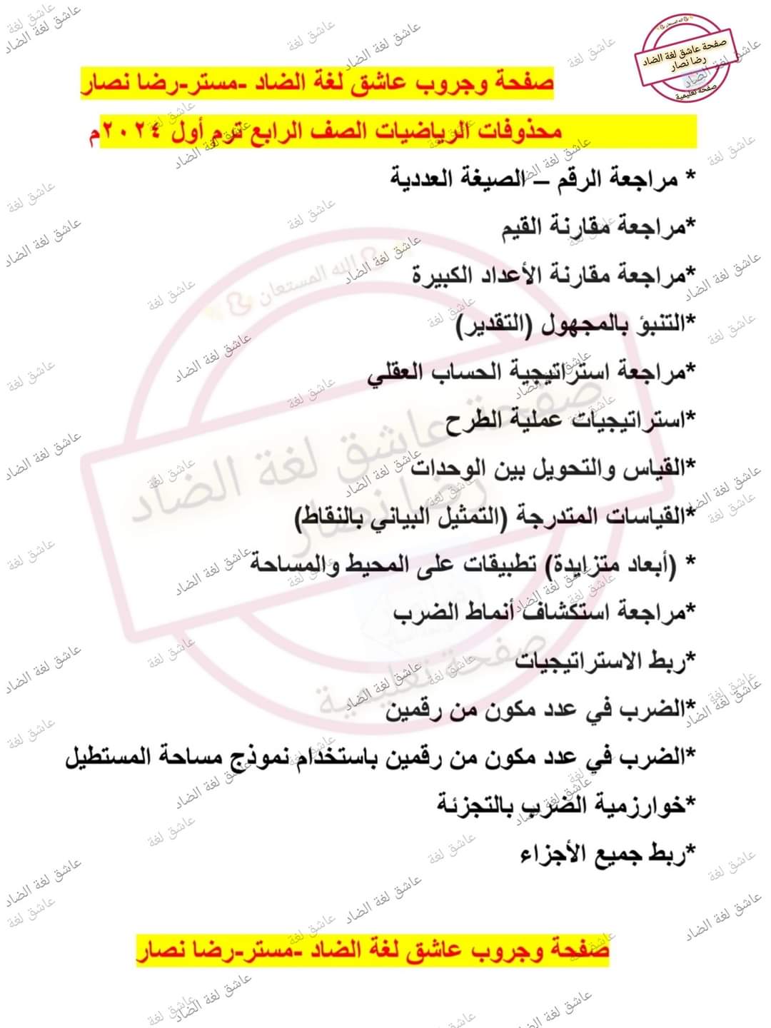 تحميل الدروس المحذوفة من منهج الرياضيات للصف الرابع الابتدائي الترم الاول 2024