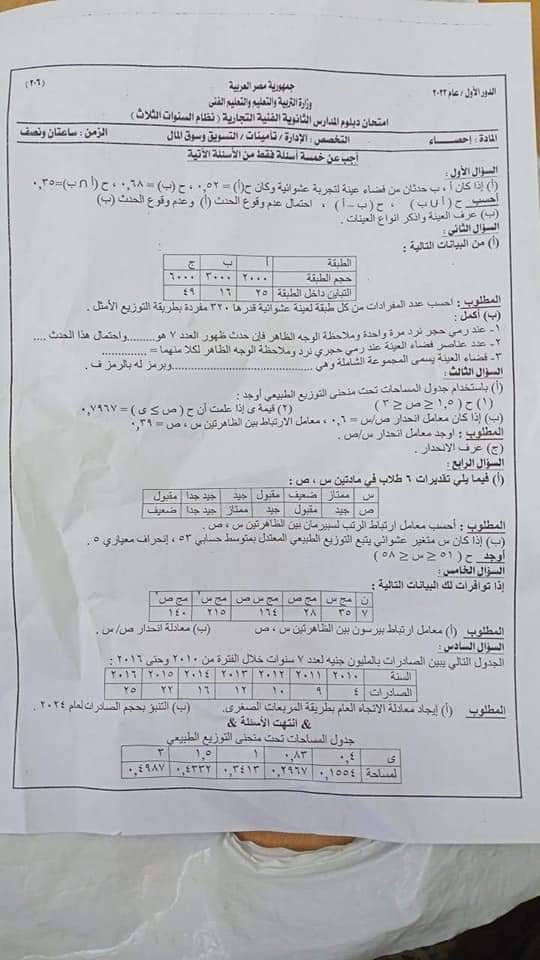تحميل حل امتحان الاحصاء لشعبة ادارة والتأمينات والتسويق الدور الاول 2023