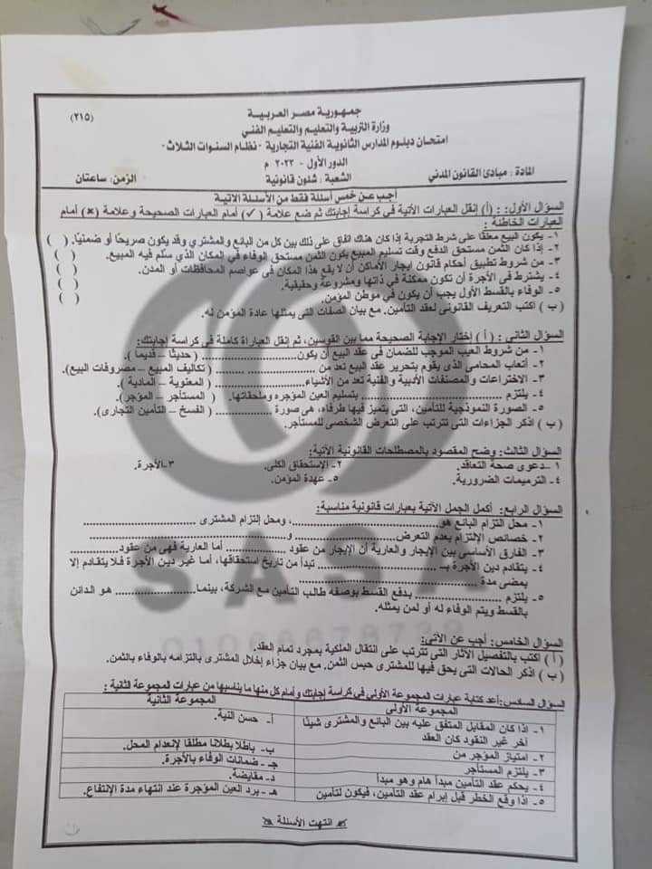 تحميل حل امتحان مبادئ القانون المدني لشعبة قانون الدور الاول 2023