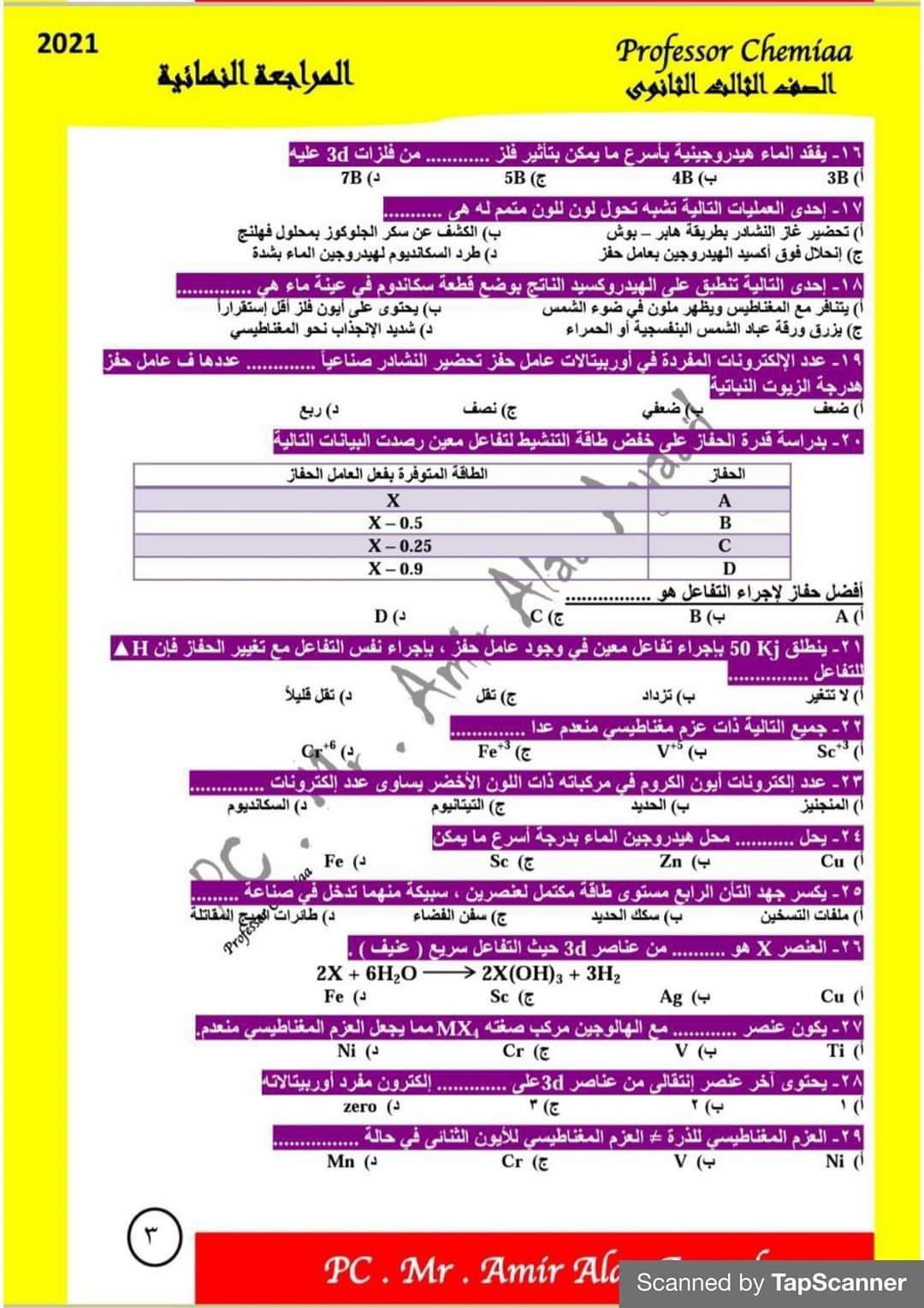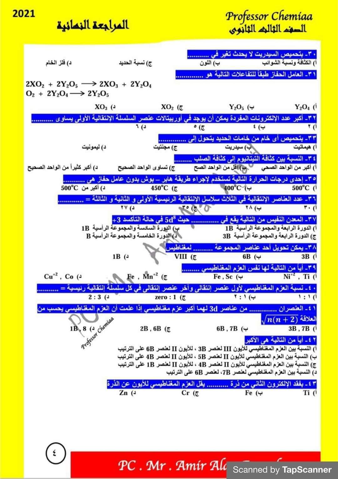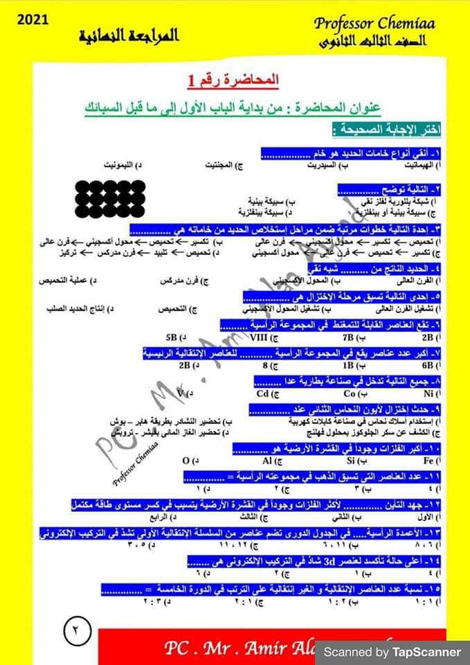 مذكرة مراجعة ليلة الامتحان في الكيمياء للصف الثالث الثانوي نظام حديث مع الاجابات
