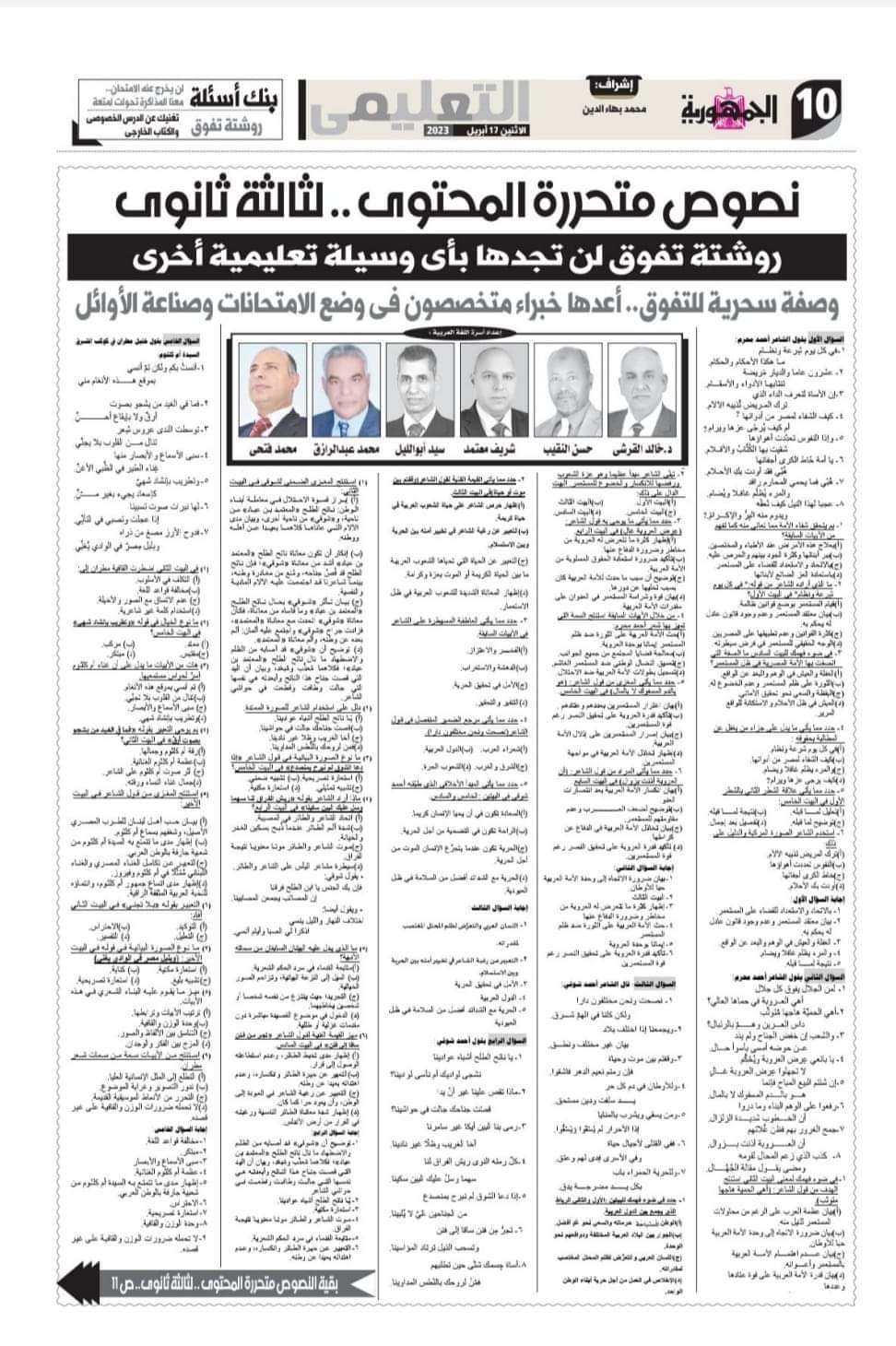مراجعة النصوص المتحررة بالاجابات من جريدة الجمهورية لن يخرج عنها الامتحان