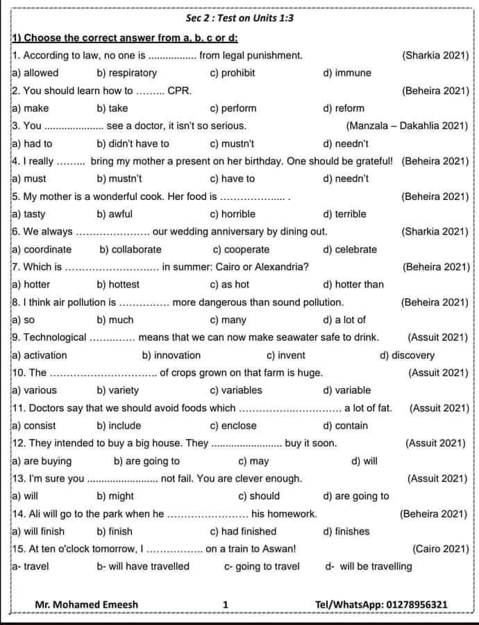 امتحانات لغة انجليزية علي اول ثلاث وحدات ترم اول ثانوي