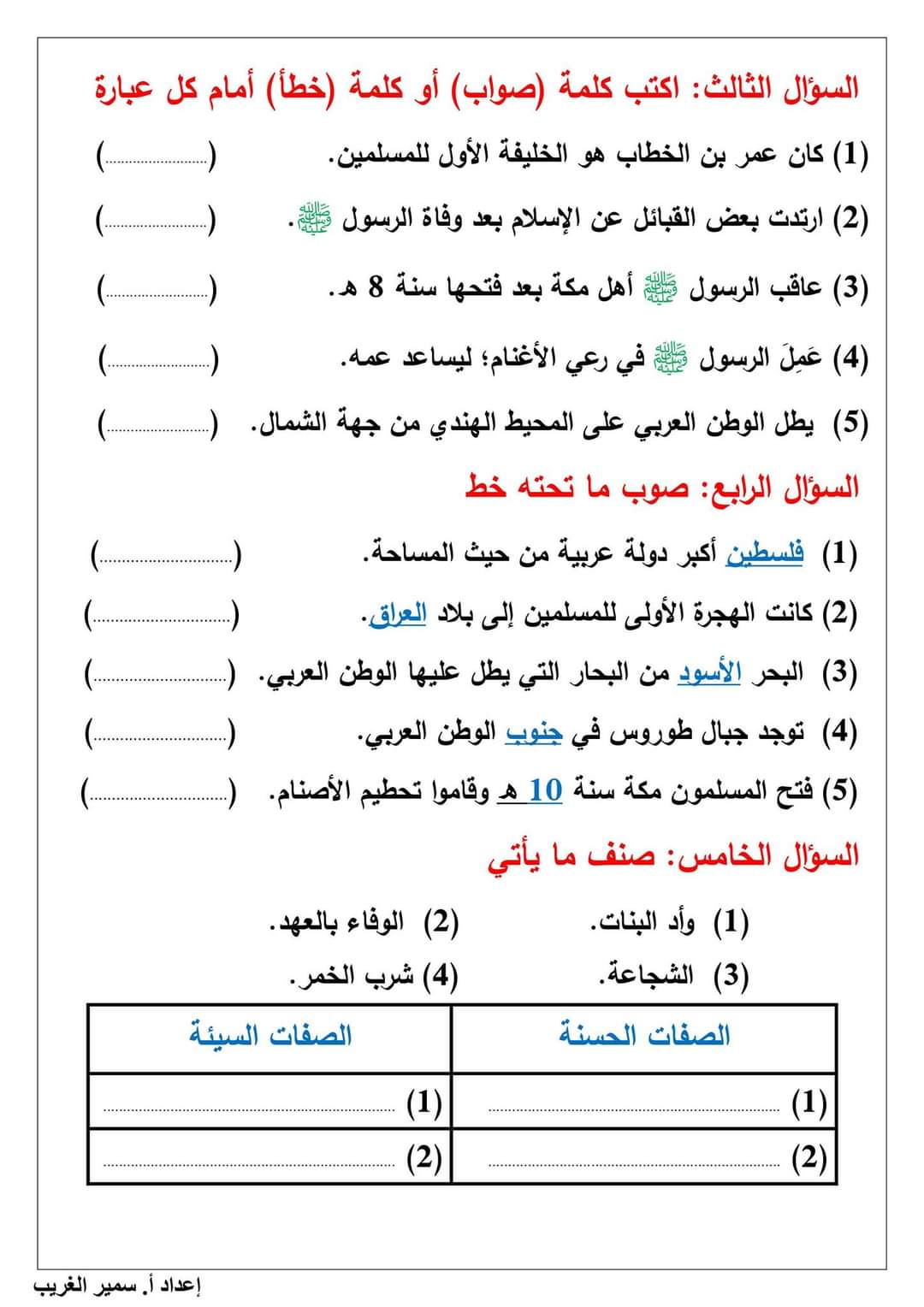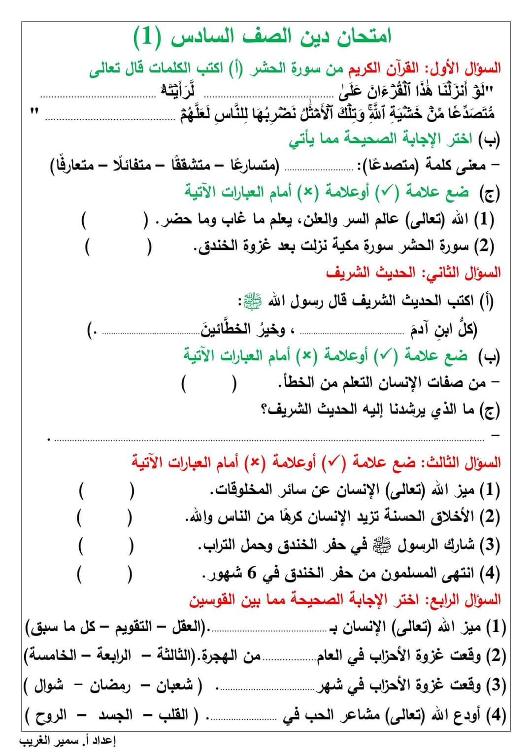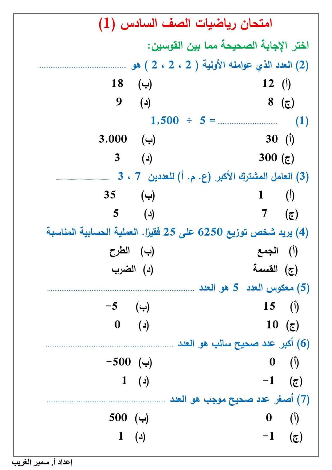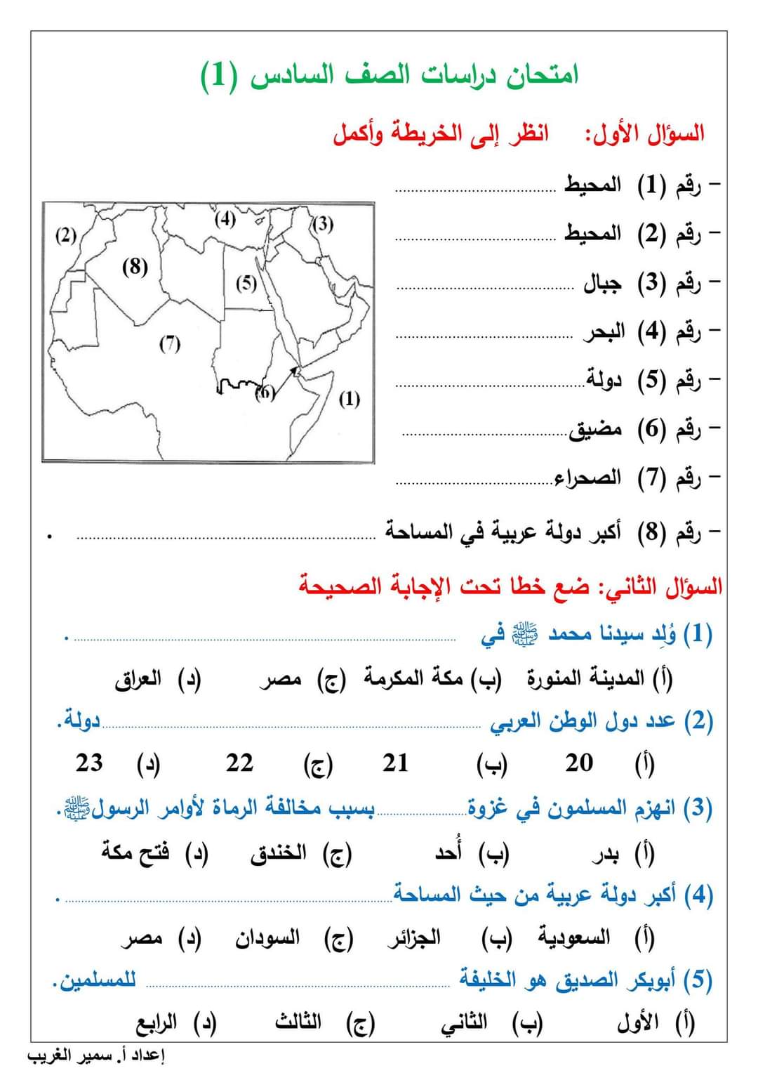 تحميل امتحانات الصف السادس الابتدائى لمقرر شهر اكتوبر لمستر سمير الغريب