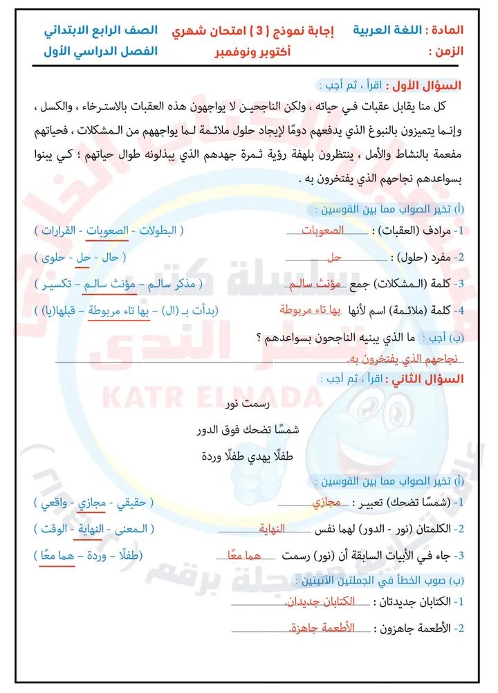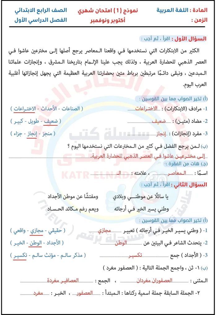 تقدم لكم منتديات كتاتيب للتعليم الإلكتروني اختبارات شهري أكتوبر ونوفمبر في مادة اللغة العربية للصف الرابع الابتدائي ترم أول.