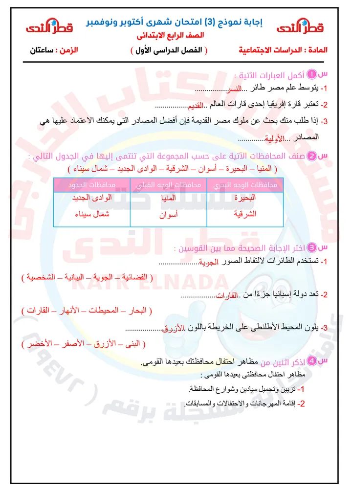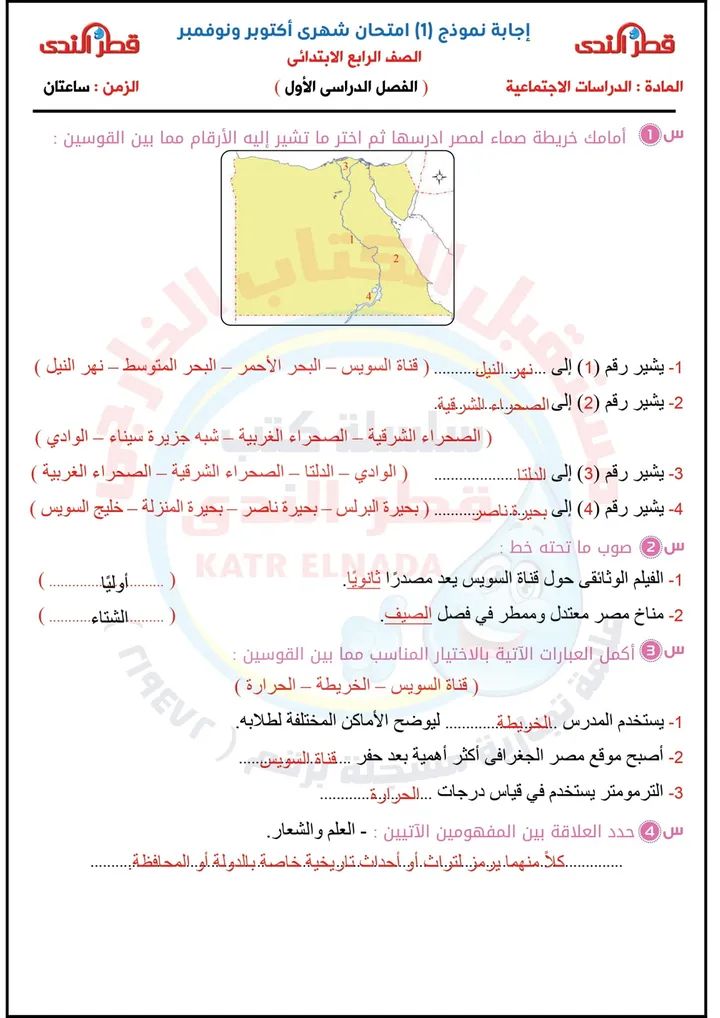 اختبارات شهري أكتوبر ونوفمبر في مادة الدراسات الإجتماعية للصف الرابع الابتدائي
