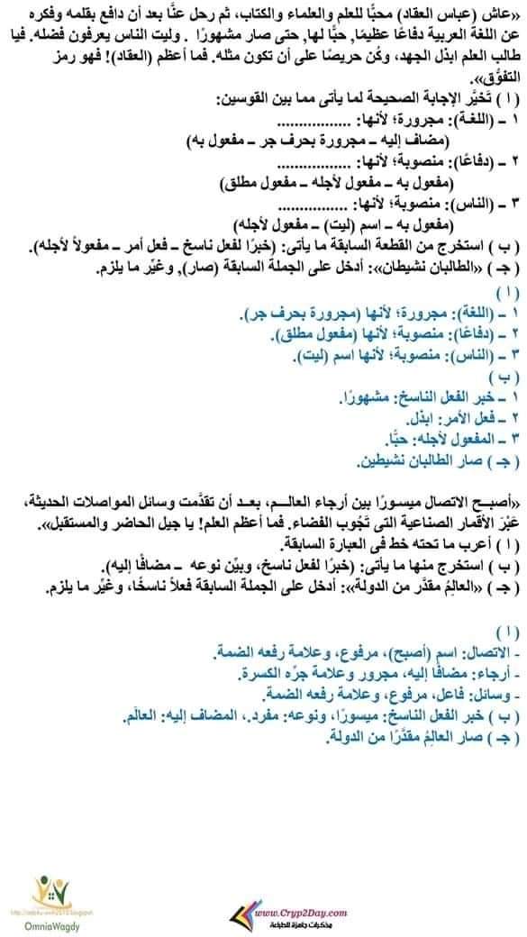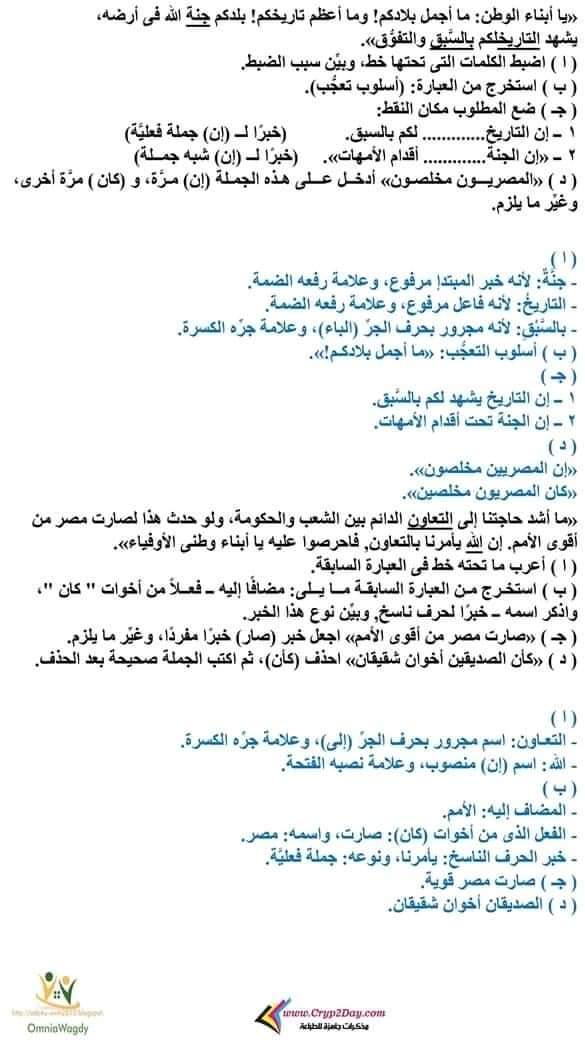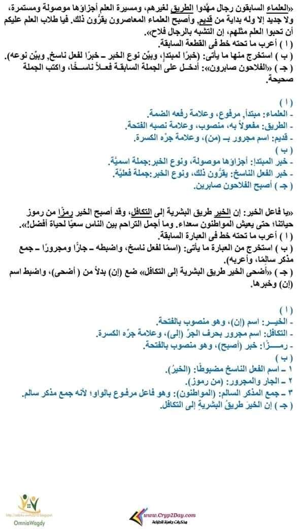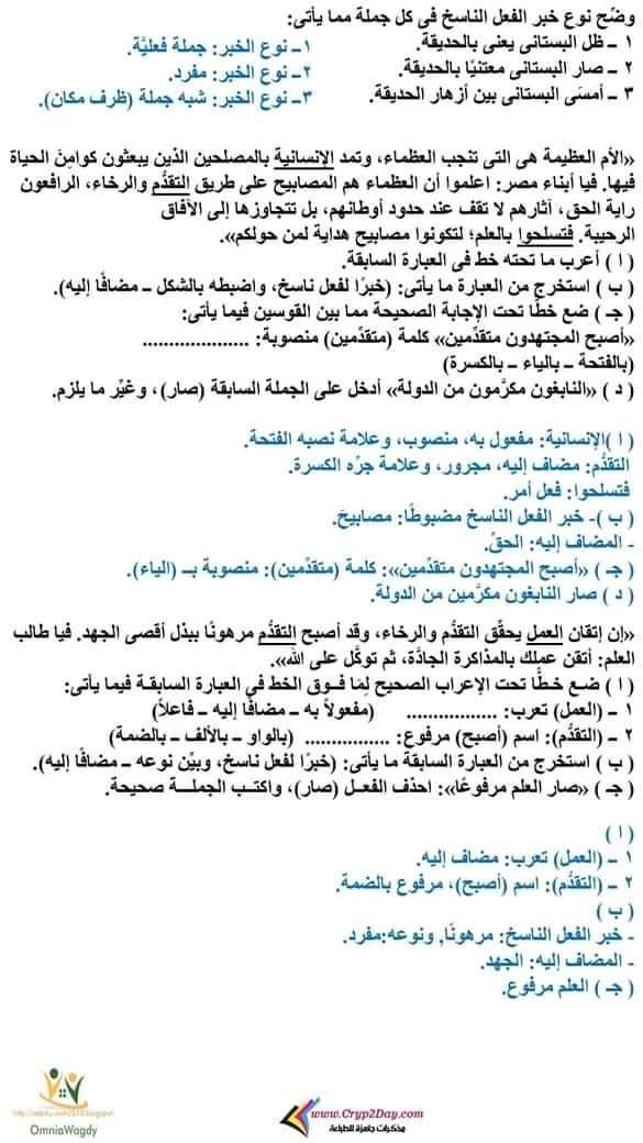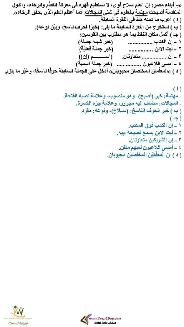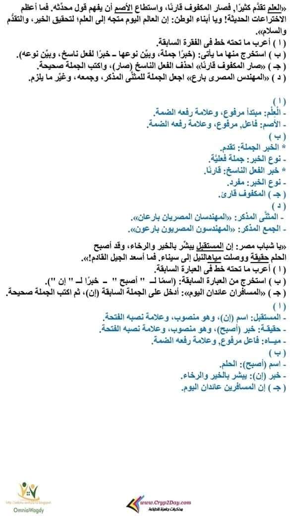قطع نحوية مجابة فى اللغة العربية للصف السادس الابتدائي الترم الأول